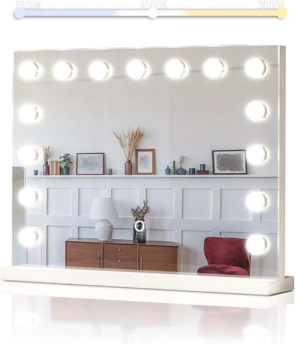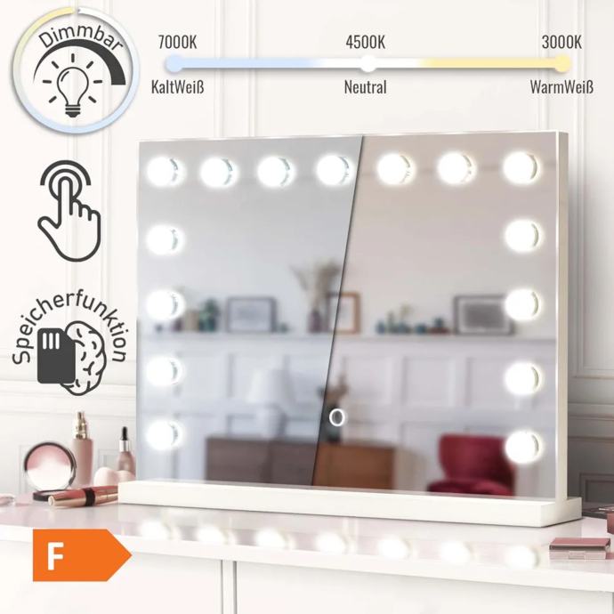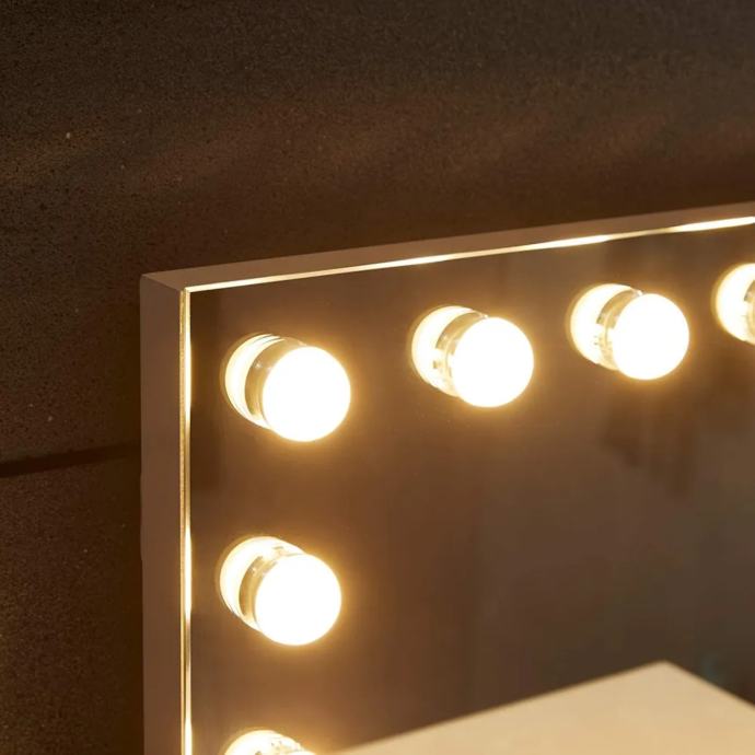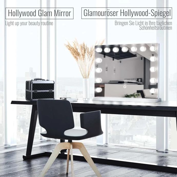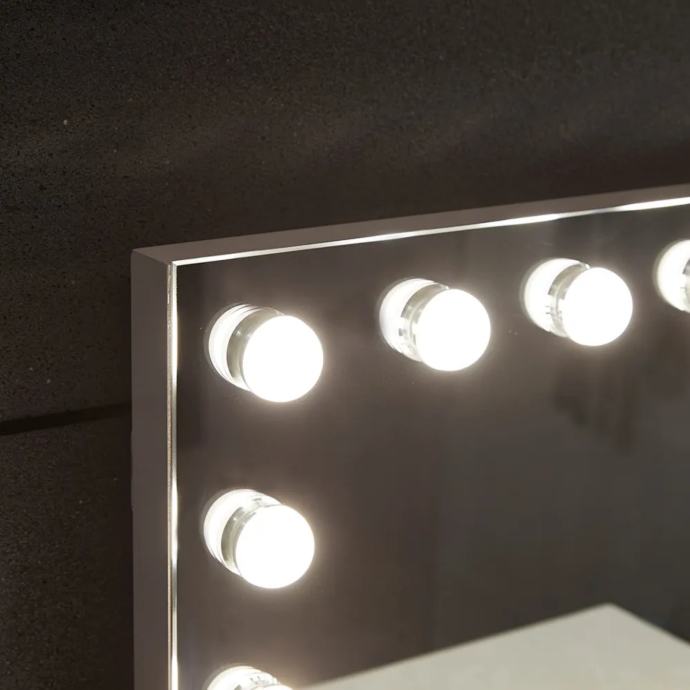 Prednosti: ovo elegantno kazališno ogledalo ima dimenzije 580 x 30 x 430 mm i ima 15 izmjenjivih LED svjetiljki, stabilnu i robusnu bazu, tri načina osvjetljenja i funkciju zatamnjivanja