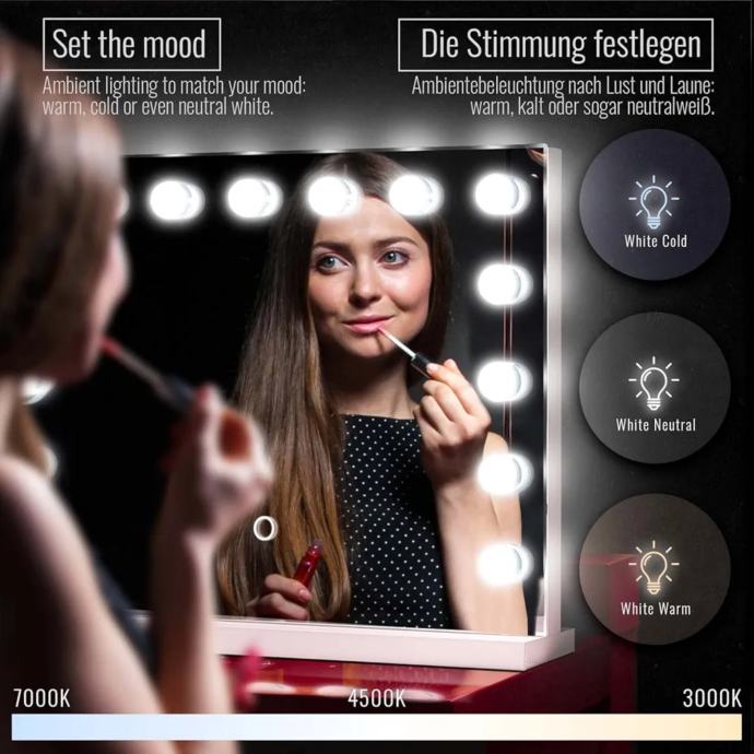 Podesivo: možete podesiti osvjetljenje stolnog ogledala na hladno (7000K), neutralno (4500K) i toplo (3000K) LED bijelo prema svojim potrebama jednostavnim dodirivanjem prstena na upravljačkoj ploči