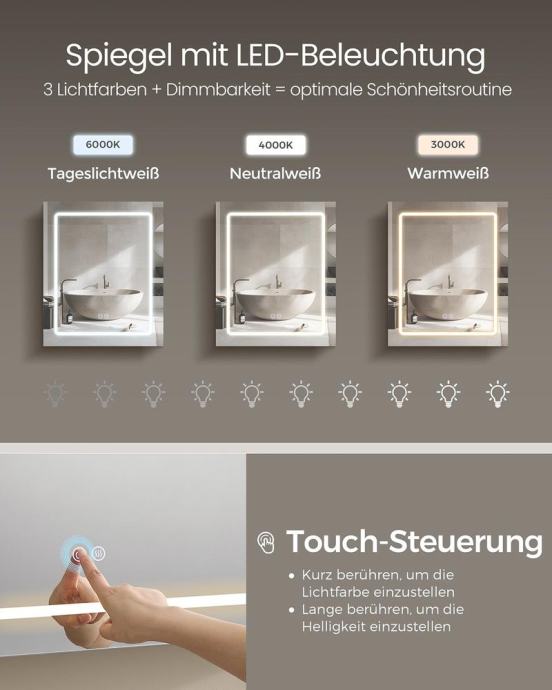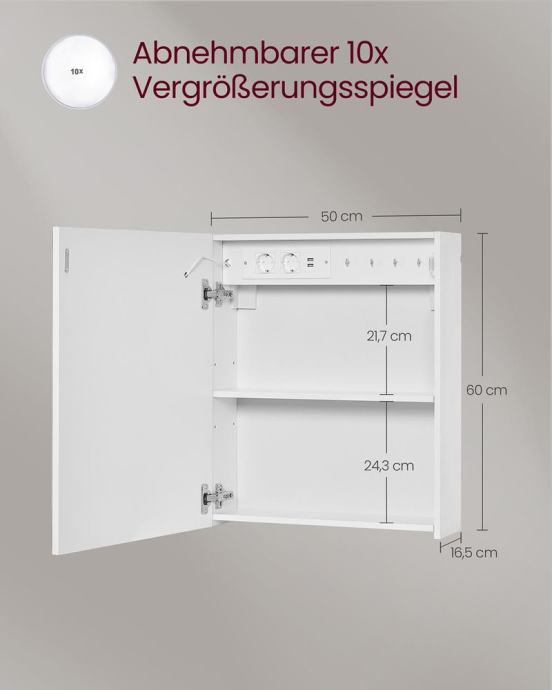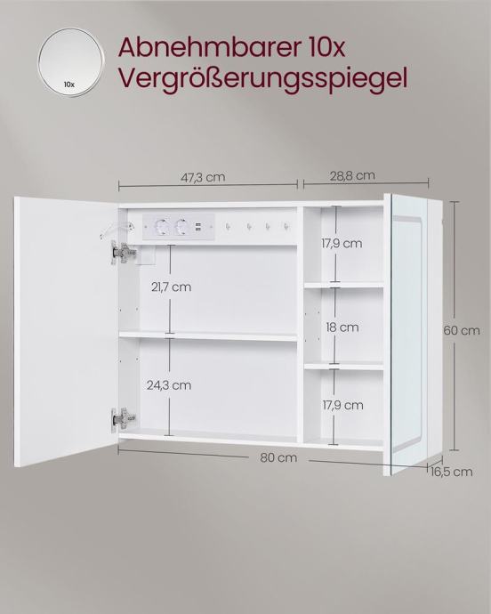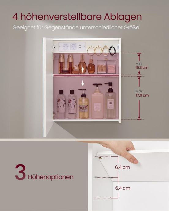 Otkrijte kolekciju KAILYN! Savršena kombinacija jarko bijele boje i glatkih površina. Uz širok izbor modela, možete stvoriti idealan dizajn interijera koji odgovara vašem ukusu. Pritisnite gumb za odmagljivanje kako biste zagrijali površinu zrcala i spriječili zamagljivanje. Zidni ormarić također ima uklonjivo zrcalo s 10x povećalom. Ormarić s ogledalom izrađen je od visokokvalitetne iverice i ima lakiranu površinu koja se lako čisti. Zahvaljujući dodirnom upravljanju s funkcijom memorije, možete fleksibilno podesiti svjetlinu i temperaturu boje LED svjetala. Dvije integrirane AC utičnice i dva USB-A priključka olakšavaju punjenje vaših uređaja. Polica u ovom kupaonskom ormariću podesiva je po visini na 3 razine, što omogućuje pohranu predmeta različitih veličina. Za sve informacije nazovite na broj telefona 092/399-75-19