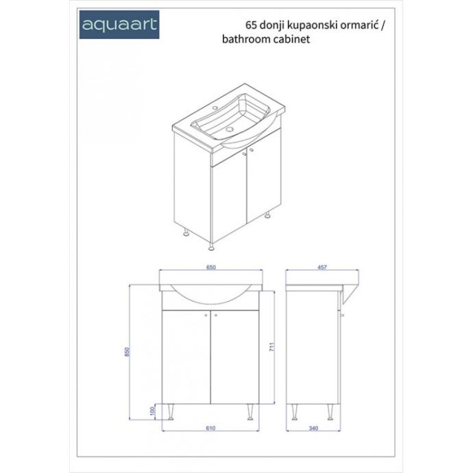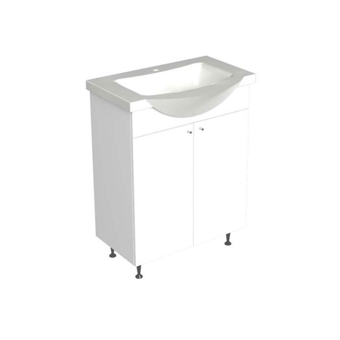 Donji kupaonski ormarić kupaonskog kompleta Paris 65. Fronte i korpus od iverala. Mat srebrne aluminijske ručkice. Keramički umivaonik uključen u proizvod. Prodaje se bez sifona.