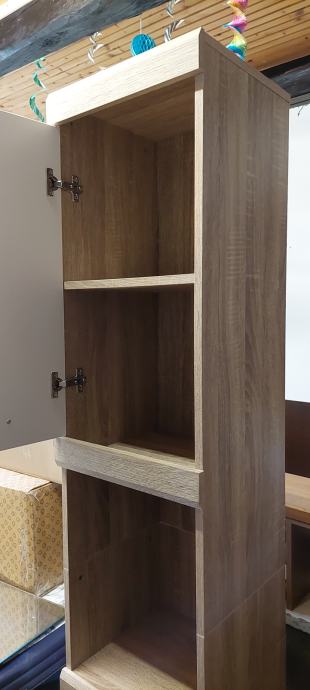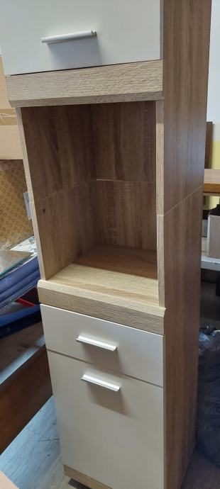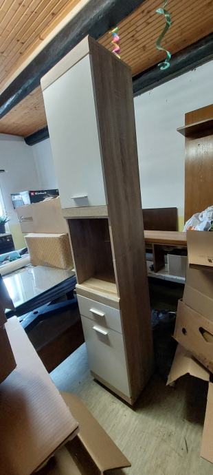 Prodajem visoki kupaonski ormarić dimenzija v190 d30 š35, vrata bijela, korpus dekor svijetlo drvo. U sredini jedna ladica i otvoren prostor, u gornjem dijelu jedna poprečna polica.