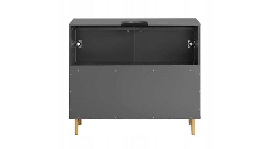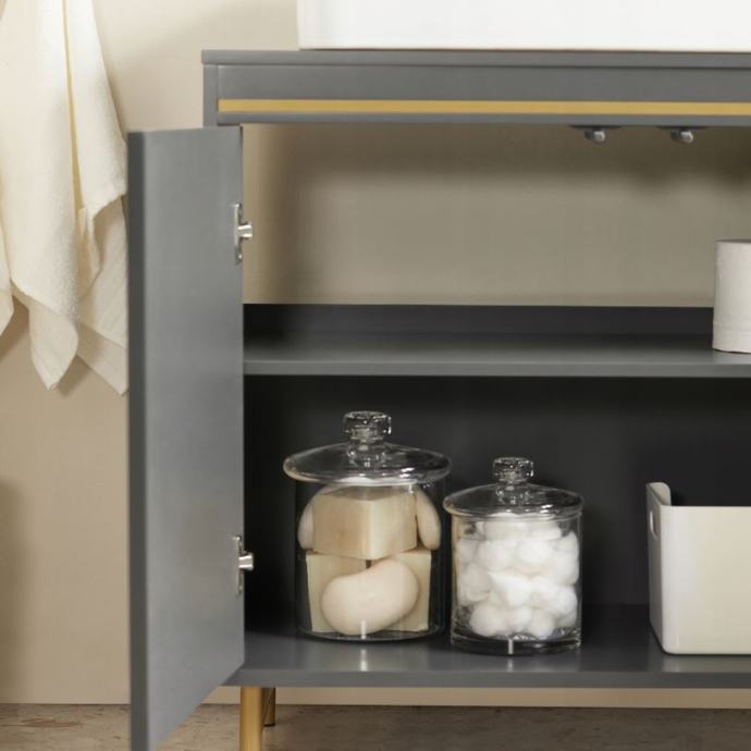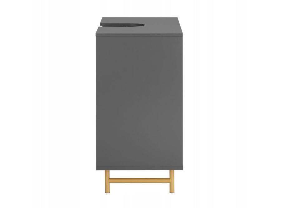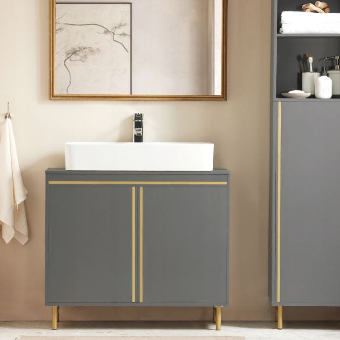 Kombinacija sivih paleta i zlatnog metala daje ovom ormariću jedinstveni šarm. I savršeno skriva neugledan sustav odvodnje.