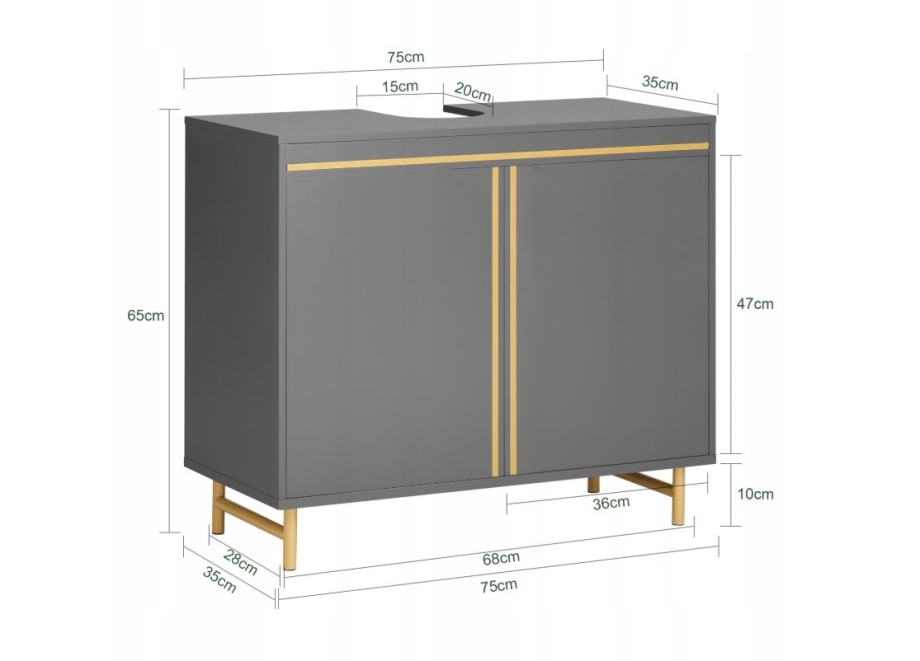 Visina kupaonskog ormarića je dobro prilagođena i zadovoljava potrebe većine ljudi. Razmak između dna kupaonskog ormarića i poda je 10 cm, što je pogodno za čišćenje kupaonice i učinkovito sprječava vlaženje ormarića.