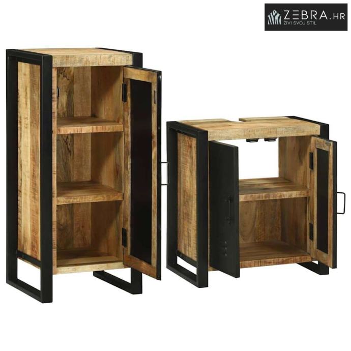 Ovaj set drvenog kupaonskog namještaja je savršen spoj rustikalnog šarma i funkcionalnosti, prilagođen potrebama suvremenih kupaonica. Njegov elegantan i čvrst izgled donosi toplinu svakom kupaonskom prostoru. Sadrži kabinu za lavabo i dodatni ormar, a svoj kompaktni dizajn iskorištava prostor u kupaonici s dodatnom dozom stila.