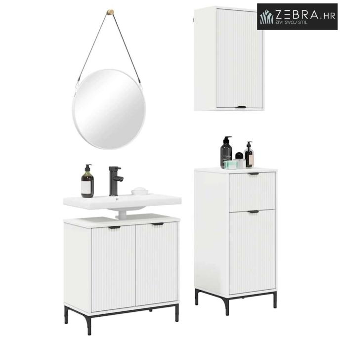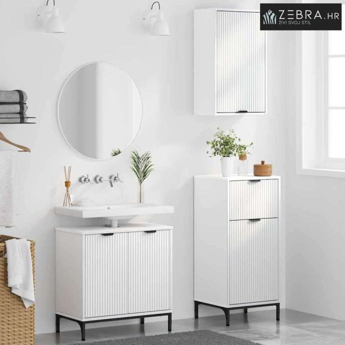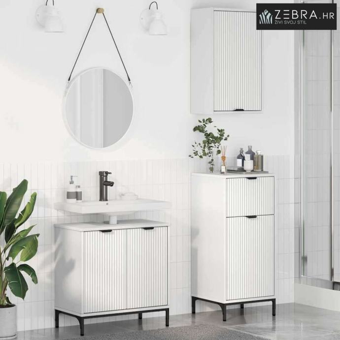 Ovaj moderni set kupaonskog namještaja je svestrano rješenje koje pomaže u organizaciji i uljepšavanju vašeg kupaonskog prostora. U setu se nalaze ormarić za sudoper, niski ormarić i visoki ormarić, pružajući kompletno rješenje za pohranu koje je stylish i funkcionalno. Njegove čiste linije i minimalistički dizajn savršeno se uklapaju u svaki moderni prostor.