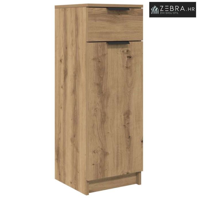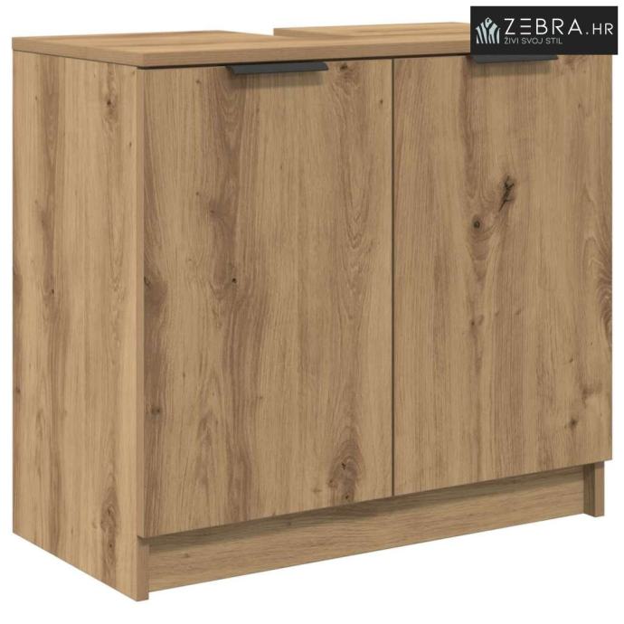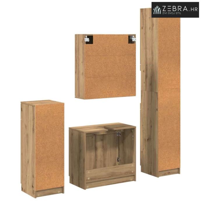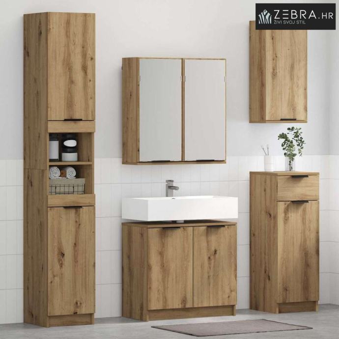 Materijali: Svaki element seta izrađen je od kvalitetnog konstruiranog drva, osiguravajući dugu životnost i čvrstoću. Ova vrsta drva nudi klasičan izgled, a istovremeno je otporna na deformacije i oštećenja uzrokovana vremenom, garantirajući pouzdanost i privlačnost dugo vremena. Njegova trajnost čini ga odličnim izborom za čestu upotrebu. Uključeni dijelovi: Set sadrži sve važne kupaonske komade: ormarić za umivaonik, ormarić s ogledalom i dva prostrana ormara, svaki od kojih je osmišljen za poboljšanje mogućnosti pohrane. Dimenzije ormarića za umivaonik su 64,5 x 33,5 x 59 cm, maksimizirajući prostor bez preuzimanja previše prostora u kupaonici. Karakteristike / funkcija / dizajn: Pravi pravokutni oblik ovih komada donosi moderan izgled, osiguravajući uredan vizual dok maksimizira funkcionalnost uz pametne opcije za pohranu. Ovaj dizajn savršen je za svakoga tko želi red i strukturu u svakodnevnom životu. Preporučene upotrebe: U vašoj kupaonici, svaki ormarić nudi značajan kapacitet pohrane, idealno za organiziranje toaletnih potrepština, ručnika i drugih neophodnih stvari. Savršeno za manje kupaonice ili svakoga tko želi efikasnije pohranjivanje. Njega i održavanje: Održavanje ovog seta super je jednostavno: redovno brišite suhom krpom da biste zadržali sjaj i čistoću. Ova metoda učinkovito uklanja prašinu i sprječava nakupljanje ostataka, osiguravajući da zadrži svoj sjaj i svježinu. Boja: Umjetnički hrast