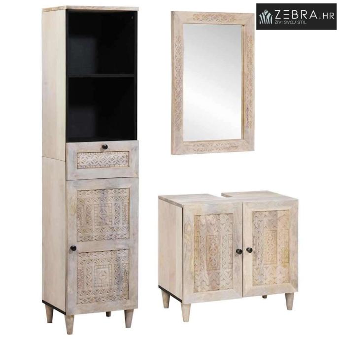 Čvrsta konstrukcija od drva manga Ovaj set je napravljen od kvalitetnog drva manga, što osigurava dugotrajnost. Prirodne boje drveta dodaju toplinu i karakter, svaki komad je jedinstven. Dovoljno je čvrst da sve drži na mjestu, ostavljajući trajan dojam u vašoj kupaonici. Obimna rješenja za pohranu Ovaj set je osmišljen s funkcionalnošću na umu, s ladicama i kabinama koje nude dovoljno prostora za toaletne potrepštine i osnovne stvari. Ravna vrata kabine i ladice pomažu da sve bude uredno, dodajući dobar izgled setu dok ga drže organiziranim. Savitljiva zidna montaža Ovaj namještaj je dizajniran za zidnu montažu, pomažući vam da uštedite prostor, savršen je za kupaonice svih veličina. Njegov elegantan dizajn donosi moderan izgled, dok ogledalo reflektira svjetlost, čineći vašu sobu većom i svjetlijom. Rustikalna i stylish privlačnost Ovaj rustikalni namještaj daje vam stvarno ugodan, kućni osjećaj. Spajajući rustikalnu ljepotu s modernom praktičnošću, nije samo funkcionalan, već i stilski akcenat za vašu kupaonicu. Jednostavno održavanje Lako se održava, samo ga obrišite suhom krpom kako bi uvijek izgledao lijepo. Ova jednostavna rutina održavanja pomaže da vaš namještaj ostane u dobrom stanju bez puno truda, čineći ga idealnim rješenjem s niskim održavanjem za uređene domove. Boja: Bijelo