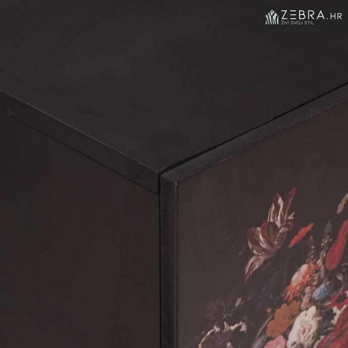 Ogledalo i elementi vrata: Veliko ravno ogledalo pruža jasan odraz za dotjerivanje i poboljšava prostornu percepciju u kupaonici. Vrata s cvjetnim uzorcima i mesinganim tipkama dodaju posebnu, suptilnu dekoraciju, kombinirajući funkcionalnost i stil s daškom luksuza.