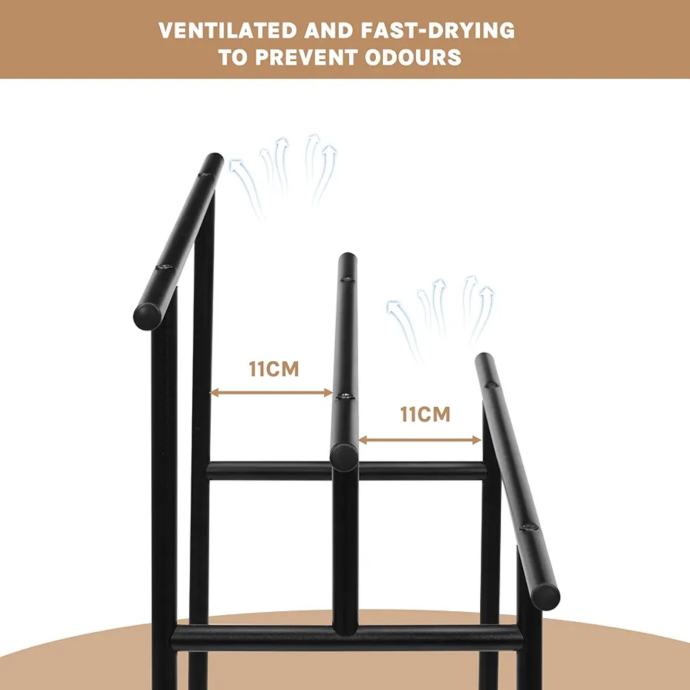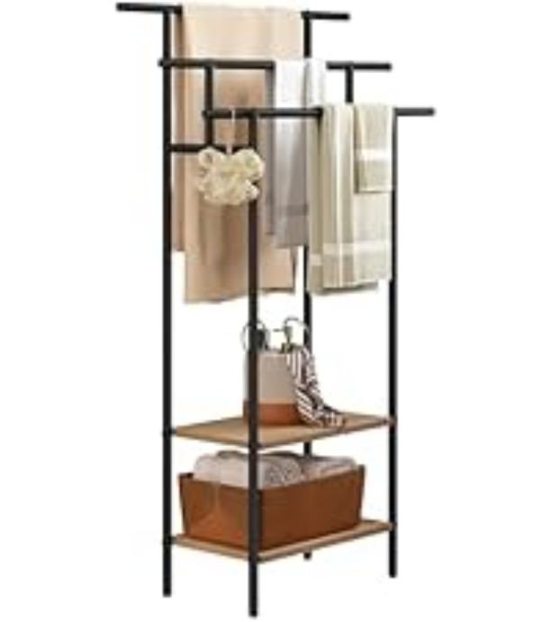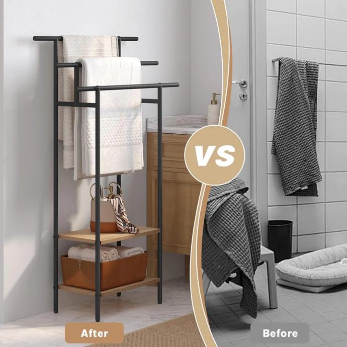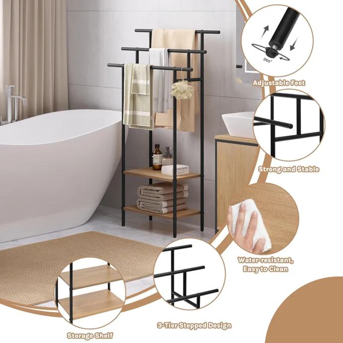 Stalak za ručnike, crni samostojeći, s 3 vješalice za ručnike, držač ručnika za kupaonicu s 2 police, za ručnike za ruke, kupaonicu, odjeću, izrađen od metala i drva