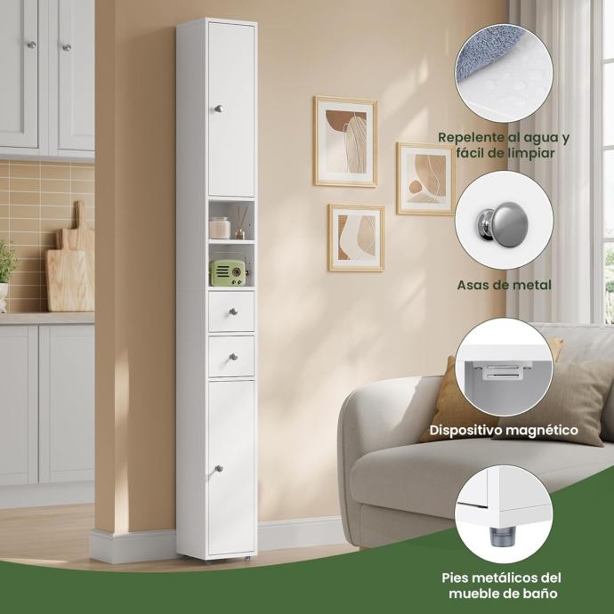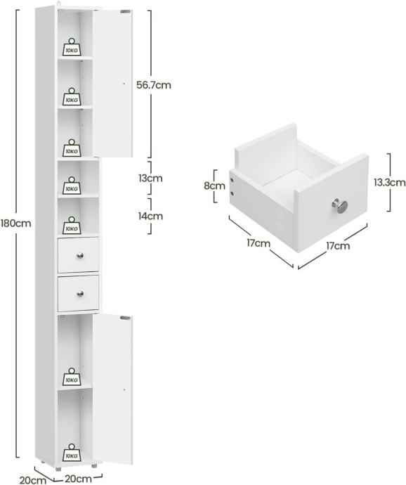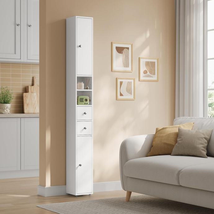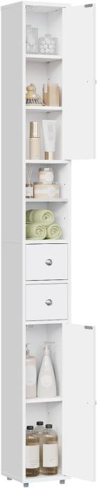 Uski kupaonski ormarić, WC ormarić s podesivim policama, 2 ladice i 2 otvorene police, bijeli, 20 x 20 x 180 cm