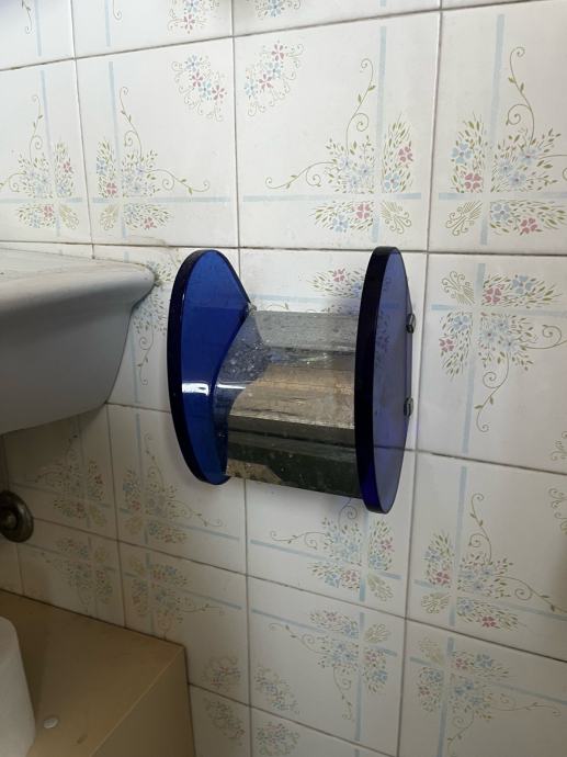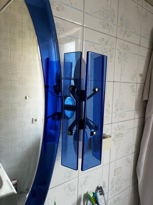 Ogledalo je uokvireno plavim kristalnim staklom, a svjetiljke su također od plavog kristala. U kompletu dolazi i zidni stalak za toaletni papir.