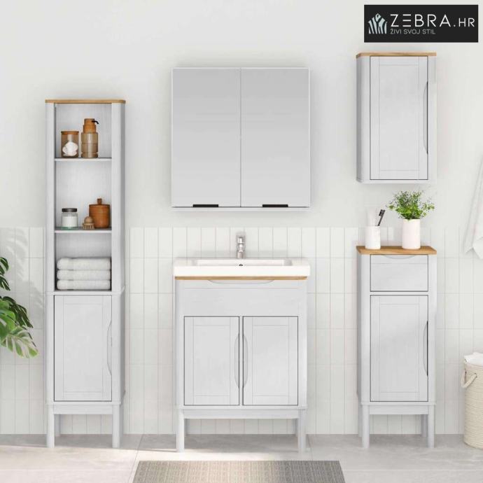 Masivna borovina: Ovaj set kupaonskog namještaja je napravljen od masivne borovine, poznate po svojoj čvrstoći i bezvremenskoj estetici. Materijal jamči dugovječnost i dodaje toplinu vašem kupaonskom ambijentu. Visoka kvaliteta pruža pouzdanu potporu za sve vaše kupaonske potrepštine, podižući funkcionalnost i izgled vašeg prostora.