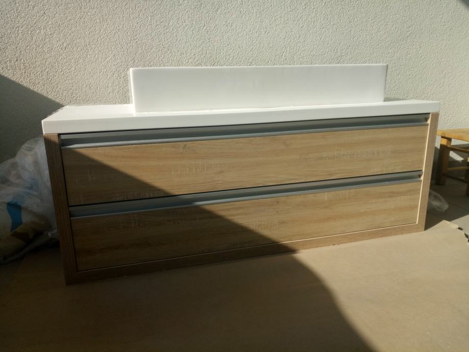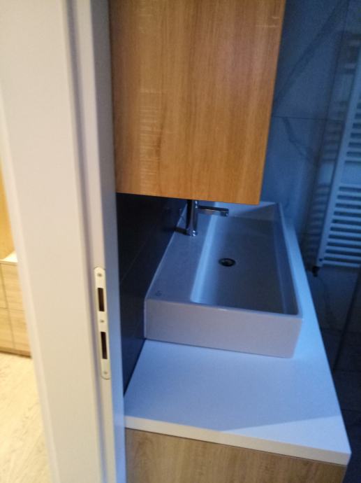 Prodajem novi donji kupaonski ormarić s umivaonikom dimenzija 132x50x50cm s dvije ladice + gornji element dim. 132x25x100cm koji se sastoji od 3 kliznih vrata koje su ogledala. Izrada od iverala 18 mm, Sonoma Oak. Gornja ploča ormarića od MDF-a 38 mm lakirano bijelo mat. Ladice "soft close" mehanizam.