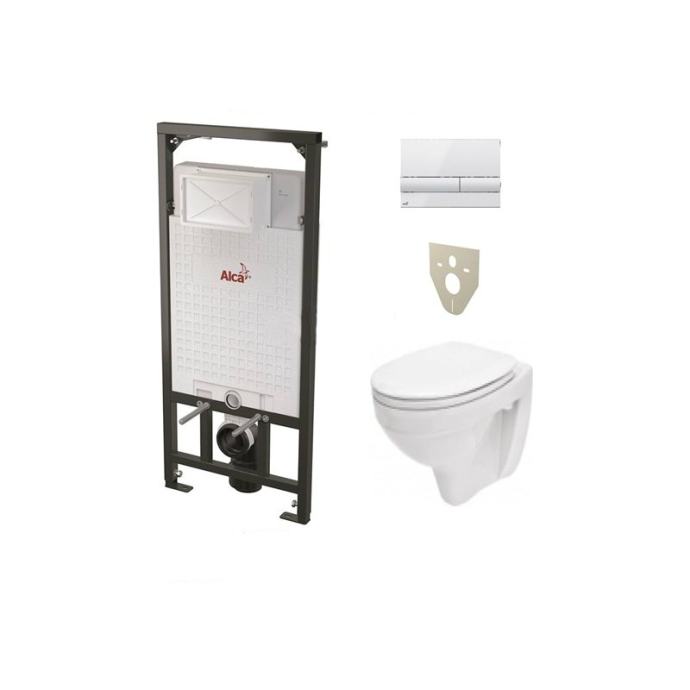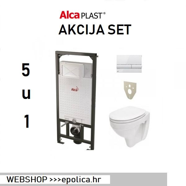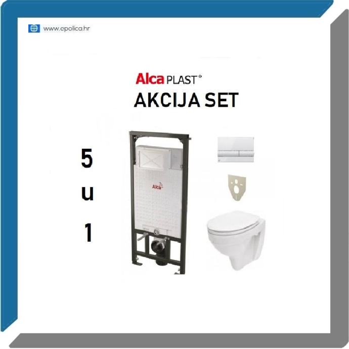 Alcaplast set sa ugradbenim vodkotlićem, tipkalom i WC školjkom sa daskom odličan je omjer cijene i kvalitete. Robusna konstrukcija na koju se montiraju vodokotlić i školjka, izrađena je od metala. WC školjka se montira na šipke pričvrščene na nosivu konstrukciju. Tipkalo i vodokotlić omogućavaju ispiranje u dvije funkcije, mogućnost ispiranja sa 6 l ili sa 3 l.