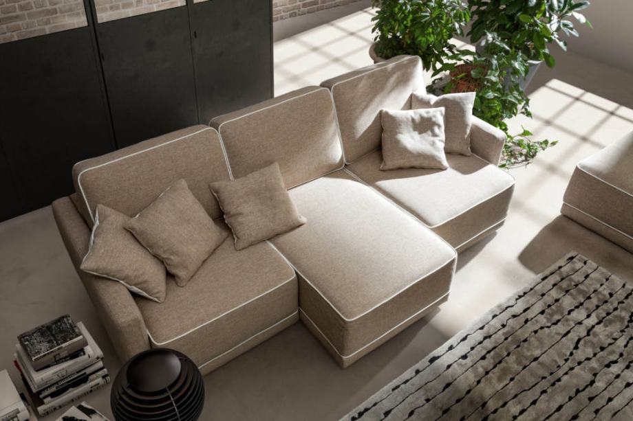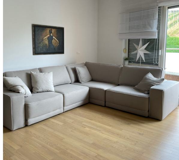 Nova kutna garnitura dimenzija 302x268 (L302 P268 H88) cm, s izvlačnim elementima te originalnim jastucima (4 komada). Boja krem/bijela kava - boja proizvođača Byte 401 s obrubom Line u boji Byte 400.