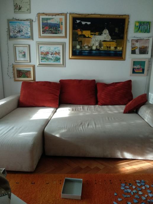 Jastuci su pomični. Materijal je mikrofibra. Kutni dio je fiksni, desni. Garnitura je stara osam godina. Kupljena je u trgovini Meblo Trade. U dobrom je stanju i ispravna je. Mijenjamo je isključivo zbog preuređenja prostorije u kojoj se nalazi. Ne odgovara nam više zbog dimenzija i toplo je preporučujemo.