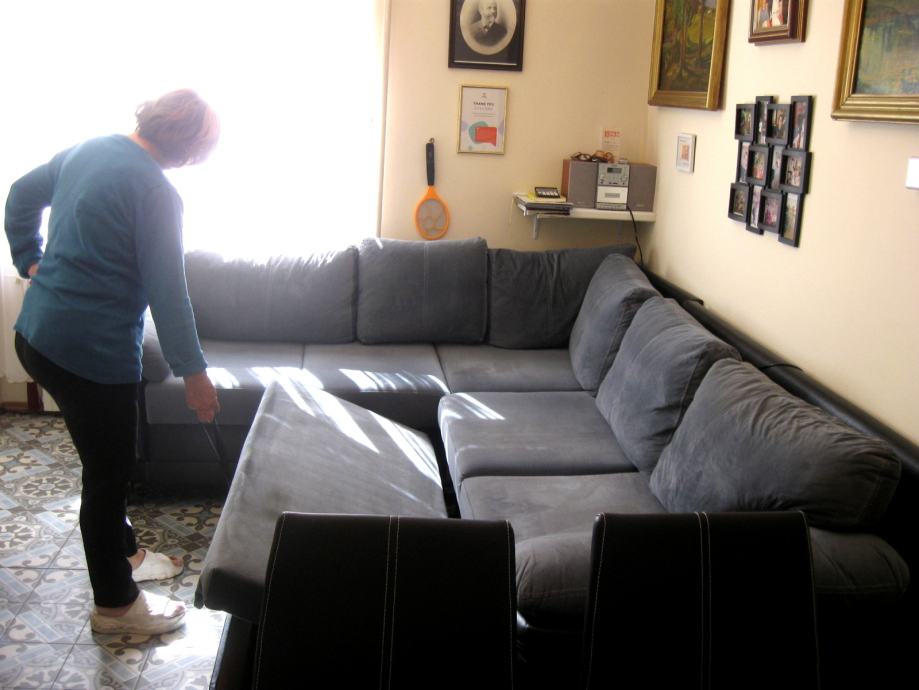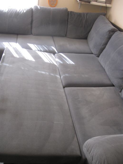 Garnitura je dimenzija 230X280 kad se razvuce ležaj je 160X280 . Visina je svugdje preko 10 cm od poda tako da robotski usisavač može proči ispod .Presvlaka na jastucima može se skidati i prati . Garnitura je jako malo korištena , ležaj za izvlačenje nije nikada korišten . Ležaji su mekani , udobni i na njima se može spavati bez razvlačenja jer su široki 80 cm i duži od 2 m , a jastuci se uklone.