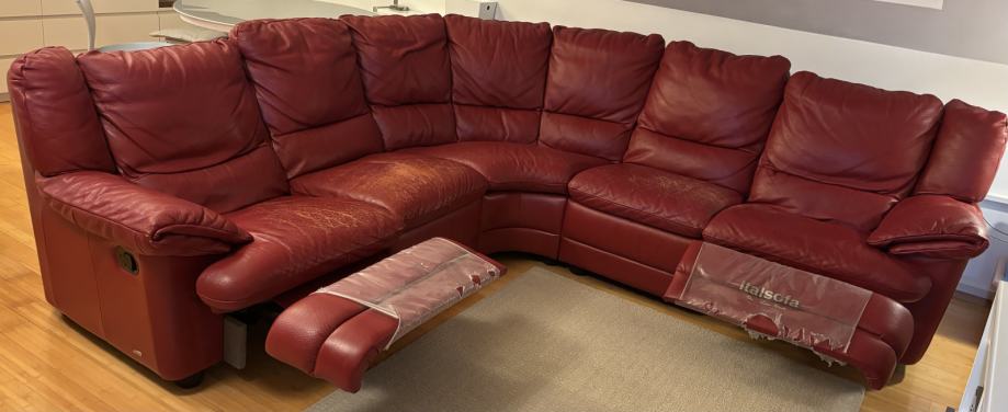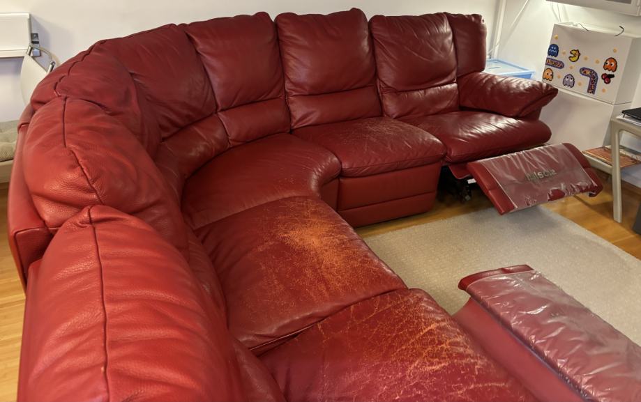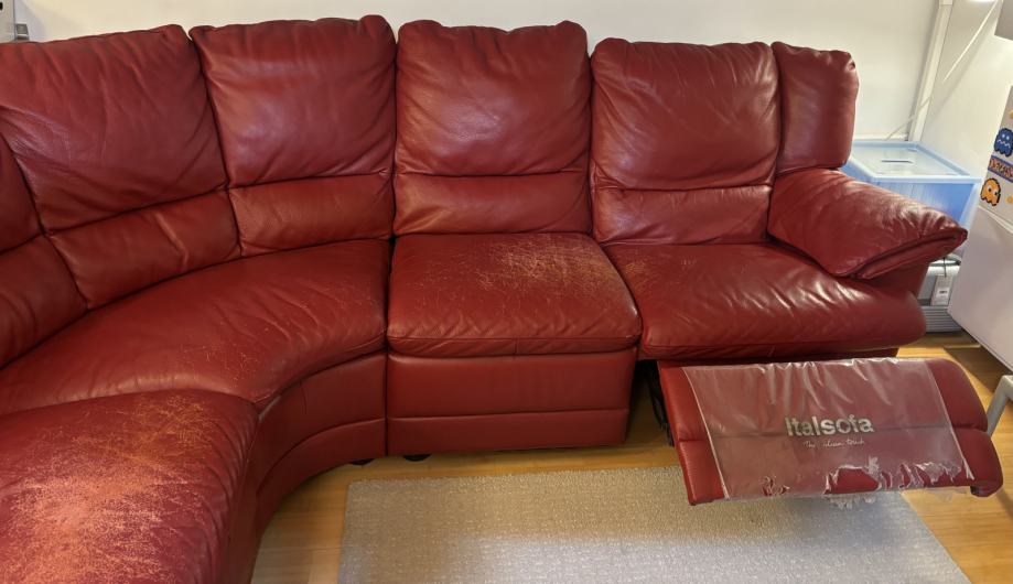 Prodajem rabljenu kutnu garnituru u dobrom stanju od prave kože. Vidljiva oštećenja na sjedištu. U garnituri se nalaze dva ispravna relax mehanizma. Punjenje sjedišta zamjenjeno prije nekoliko godina. Dimenzije garniture su 265 cm x 265 cm. Garnitura izrazito udobna.