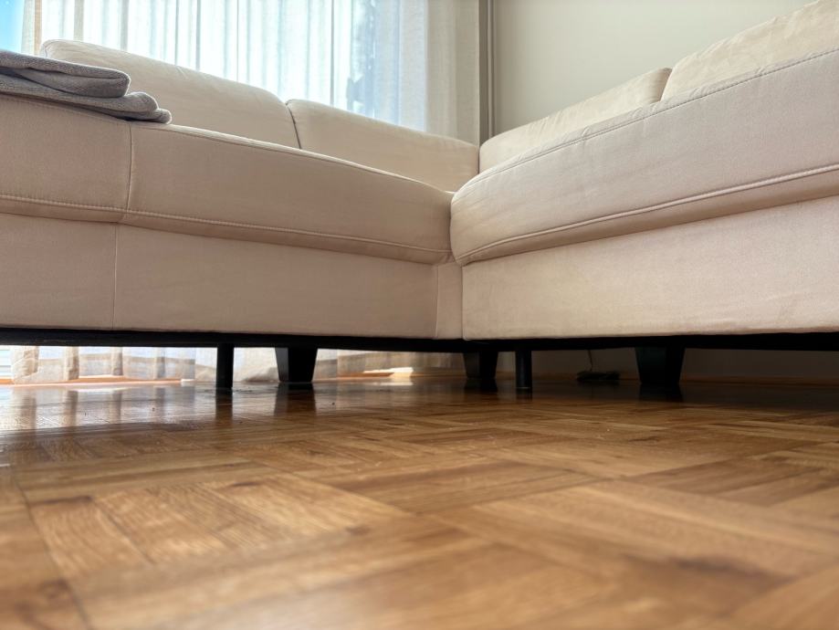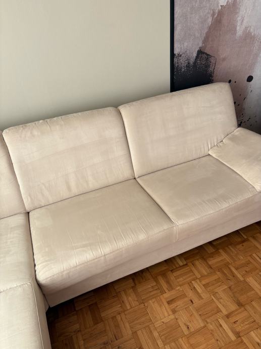 Prodajem kutnu garnituru u krem/bež boji presvučenu tkaninom mekanog, baršunastog izgleda. Garnitura se sastoji od trokrakog kauča i chaise longue dijela koji zajedno čine ugodan L-oblik. Noge su tamne boje, a sjedišta i nasloni za leđa su prostrani i udobni. Pogodna je za dnevni boravak srednje do veće veličine.