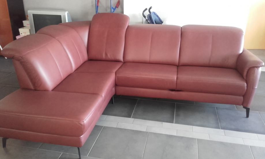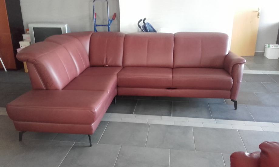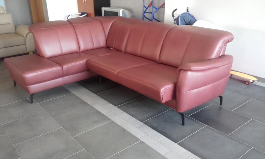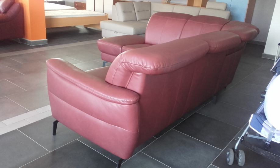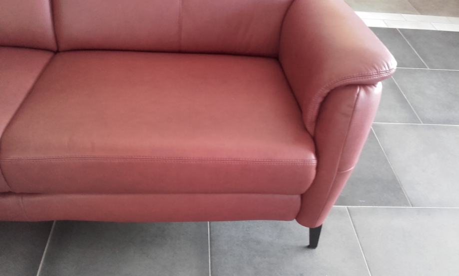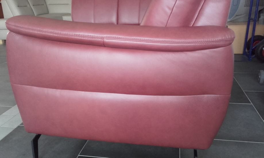 Garnitura od posebne prirodne kože, vrlo neobične bordo boje, sa mekom kožom koja je na pojedinim dijelovima prošivima koncem u boji kože.