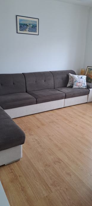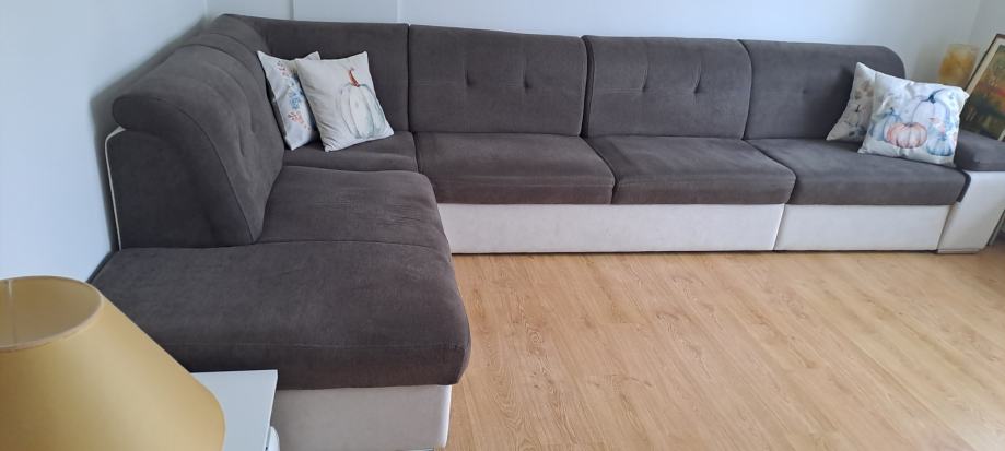 Velika kutna garnitura smeđe boje na razvlačenje i sa skladišnim prostorom. Duza strana je 390 cm.