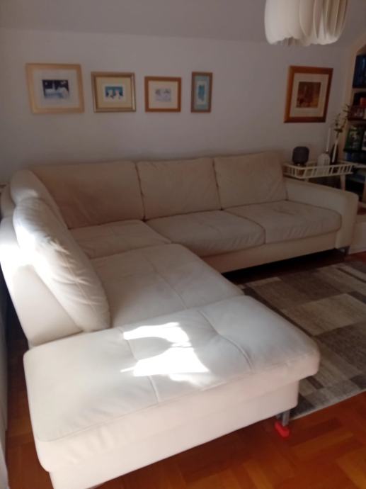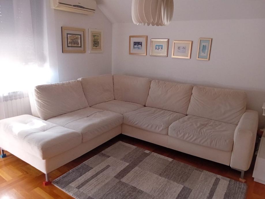 Prodajem kutnu garnituru navedenih dimenzija, materijal ne upija tekućine, te je pogodan za održavanje. Vidljivi su manji tragovi korištenja na pojedinim dijelovima, zbog kojih je cijena prilagođena, ali u globalu je garnitura kao nova. Plaćena cijena novog je iznosila 2500 eura, te je ova garnitura bila izložena u luksuznijem dijelu trgovine.