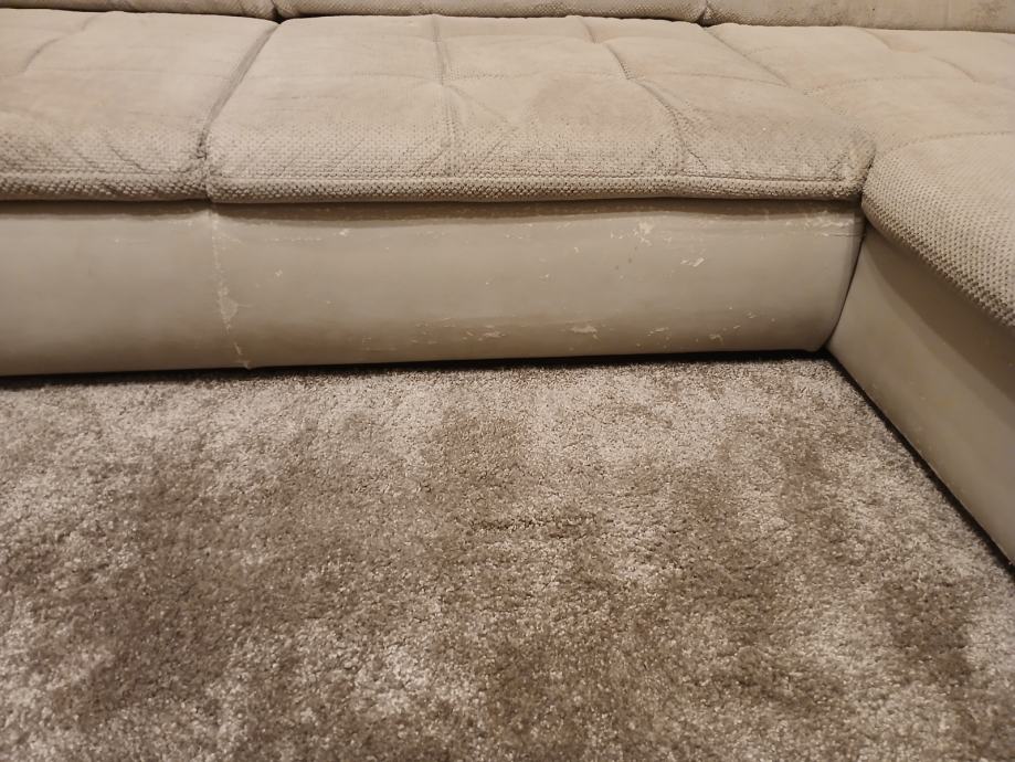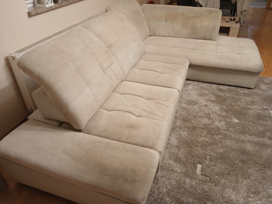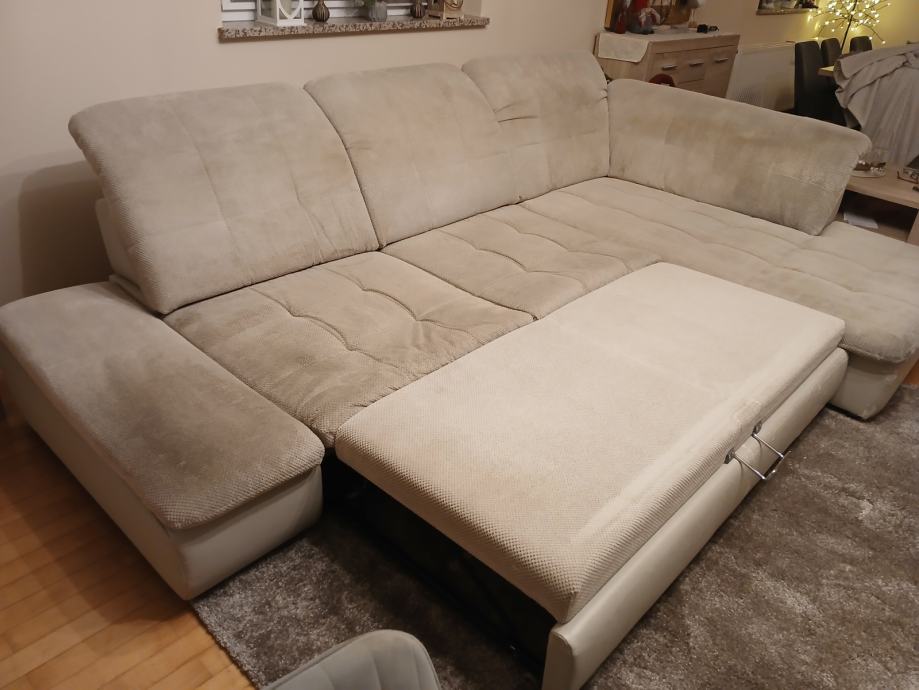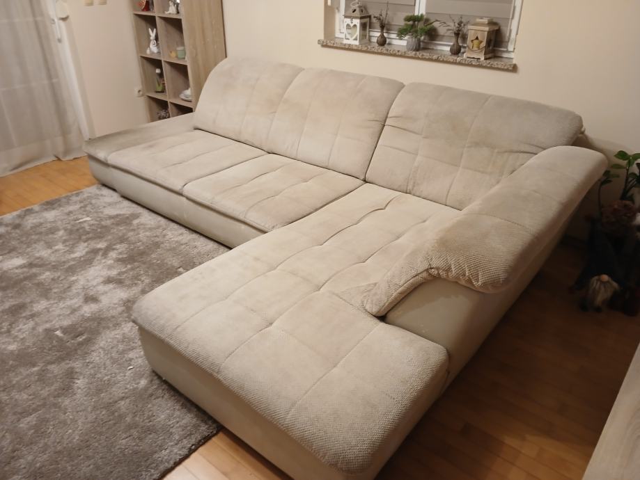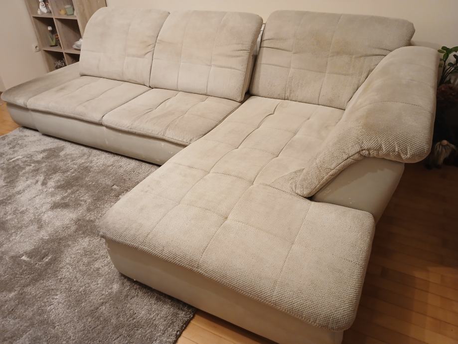 Kutna garnitura u funkcionalnom stanju u tekstilu, na donjem dijelu sitna oštećenja na eko koži. Izvlačni naslon za leđa i podešavanje uzglavlja. Potrebno kemijsko čišćenje.