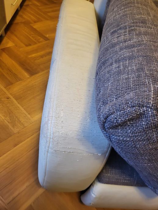 Garnitura je očuvana, s oštećenjem na eko koži (na nekim mjestima se guli), što ne utječe na funkcionalnost ili udobnost.