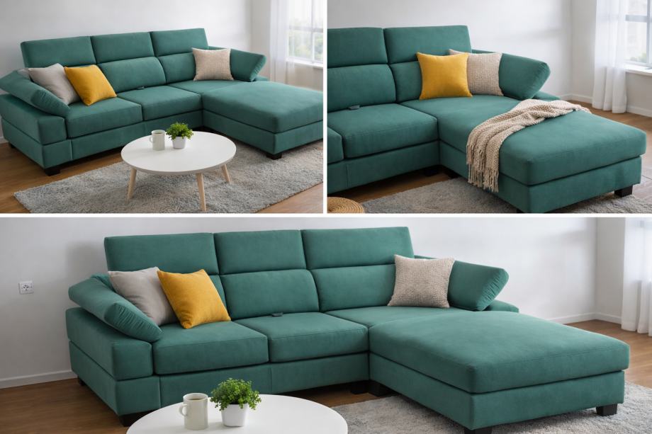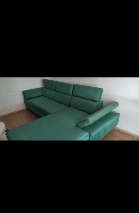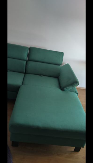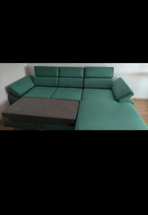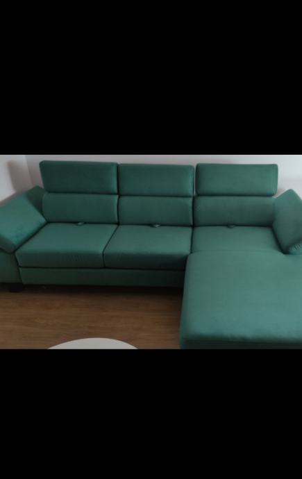 Obnovite svoj dom novom,elegantnom kutnom garniturom- savršena za blagdane koji dolaze.Nova,spremna da donese toplinu i udobnost u Vaš prostor.Kutna je zelene boje, ima pomične glavonaslone 3 komada, pomične naslone za ruke sa strane, te se sva tri dijela naslona za leđa mogu pomicati prema naprijed dok se sjedi ili ih pomaknuti skroz iza dok se odmara na garnituri.Garnitura također ima izvlačni ležaj.Garnitura je nova,bez ikakvih tragova korištenja..