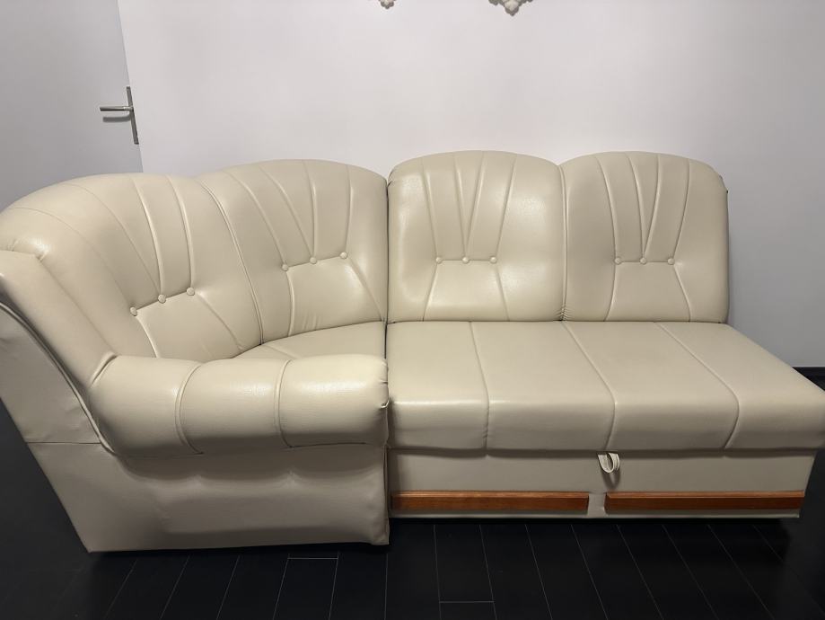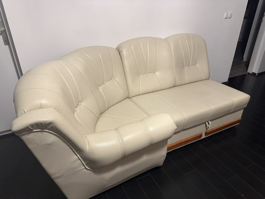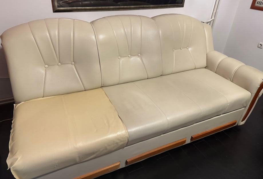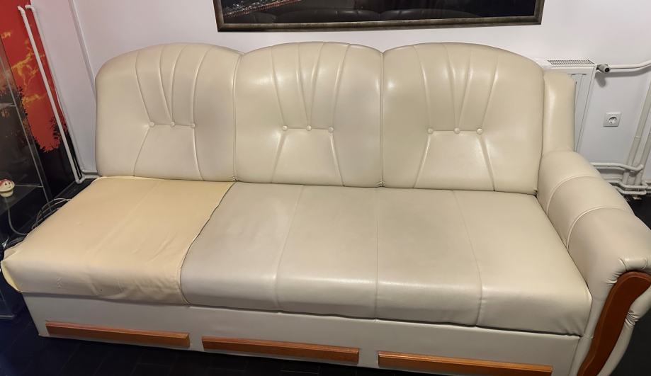 Poklanjam masivnu kutnu garnituru. Trenutno je razdvojena u dva dijela (nalazi se na suprotnim stranama dnevnog boravka). Jedan dio se razvlači u ležaj i taj je malo oštećen (umjetna koža se na jednom manjem dijelu krenula guliti te je priručno zalijepljen naljepnicom koja oponaša umjetnu kožu. Isto je vidljivo na fotografiji). Drugi dio ganiture je neoštećen i ima ladicu za odlaganje koja se otvara potezanjem ručke. Garnitura se obično spaja jedna na drugu te čini komplet ali se može koristiti i odvojeno u prostoru.