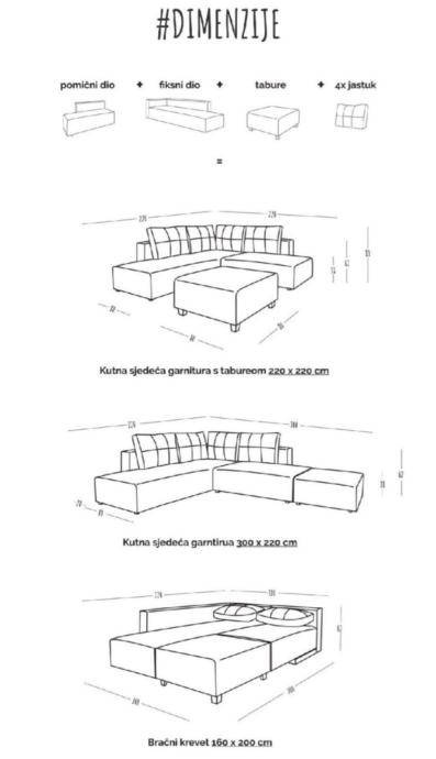 Može biti kutna, sjedeća garnitura, bračni krevet ili produžena sofa. Lako se promjeni iz sjedeće garniture u ležište jer je pomični dio na silikonskim kotačićima. Ležište se može napraviti za nekoliko sekundi jednostavnim pomicanjem.