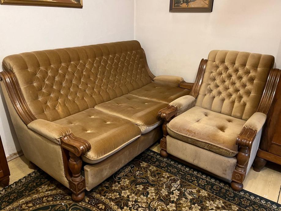 Namještaj je očuvan sa masivnim drvenim izrezbarenim rukohvatima.