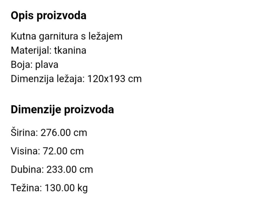 Prodajem navedenu kutnu garnituru, stara je par mjeseci, bez ikakvih oštečenja. Prodajem jer nam je prevelika.
