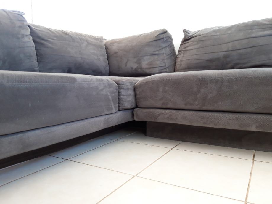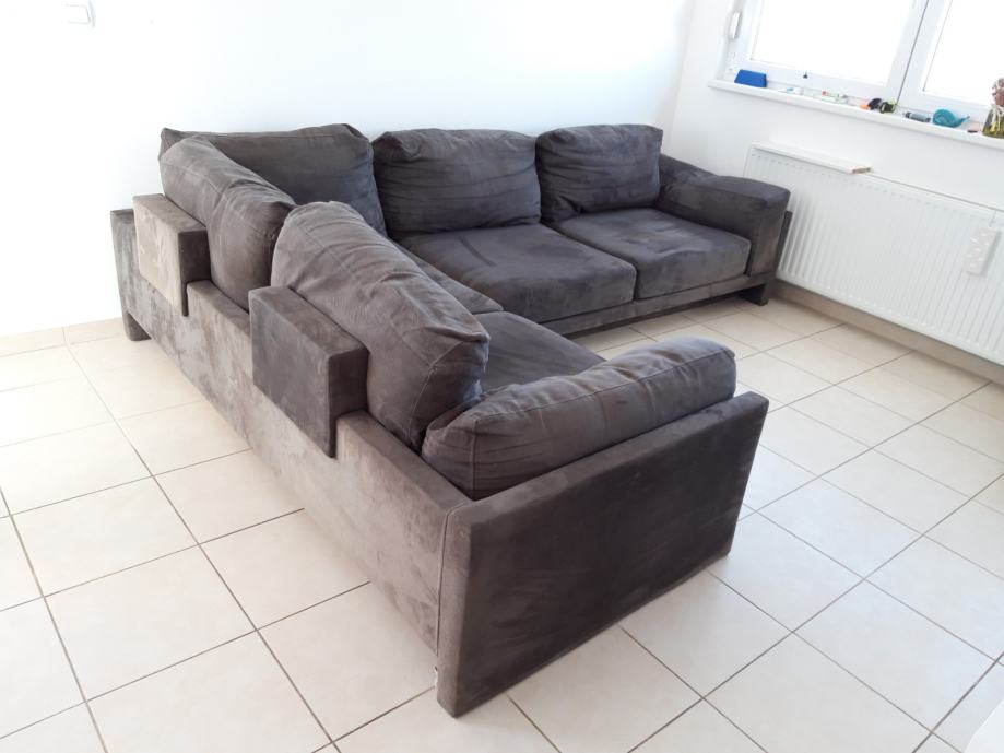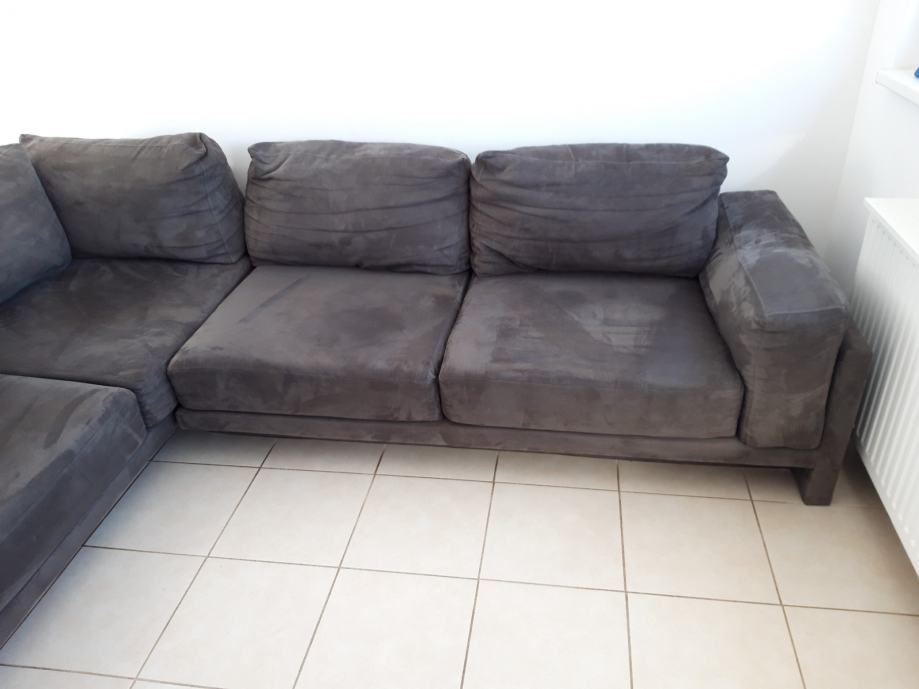Prodajem modernu kutnu garnituru od štofa, tamno siva boja, čvrsta i periva tkanina. Mjere su 286x214x83. Svim jastucima je moguće skinuti navlaku i oprati. Kut je lijevi. Garnitura je 4,5 godine stara, ali dobro očuvana, bez poderotina i fleka. Prilikom korištenja uvijek je bila prekrivena prekrivačima.Jedino je lagano izblijedio dio lijevog kuta koji je izložen suncu.