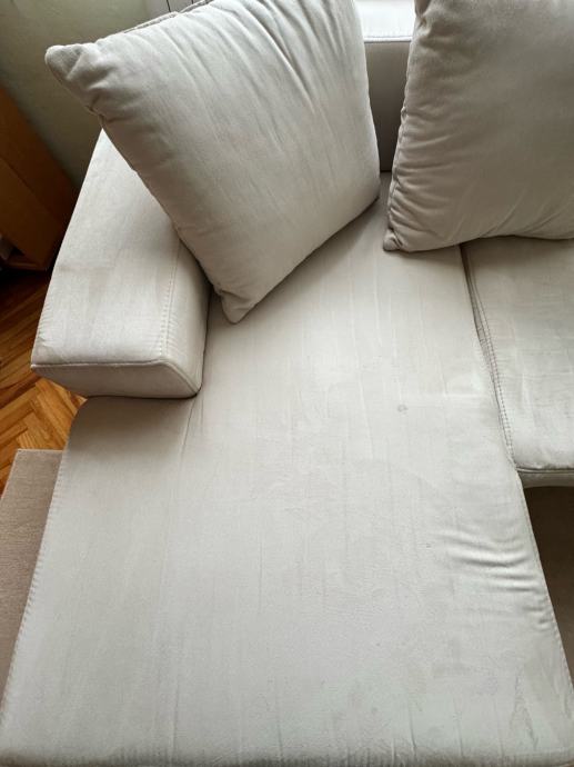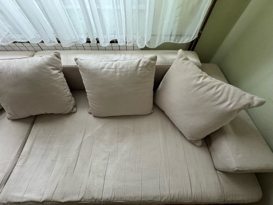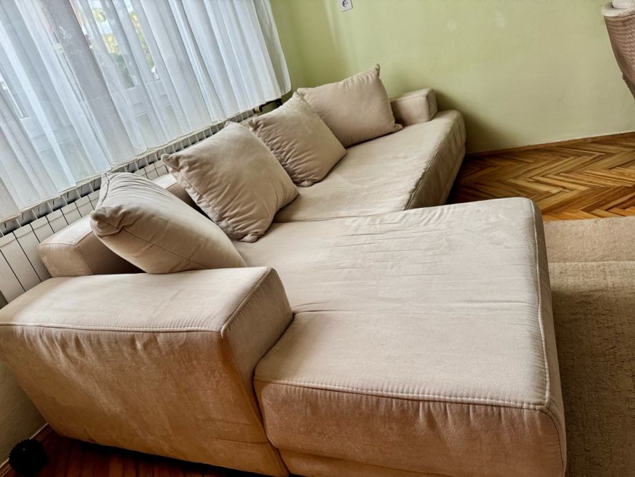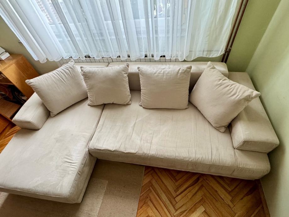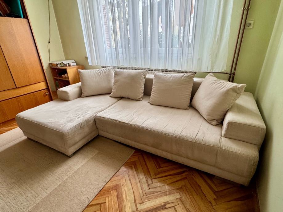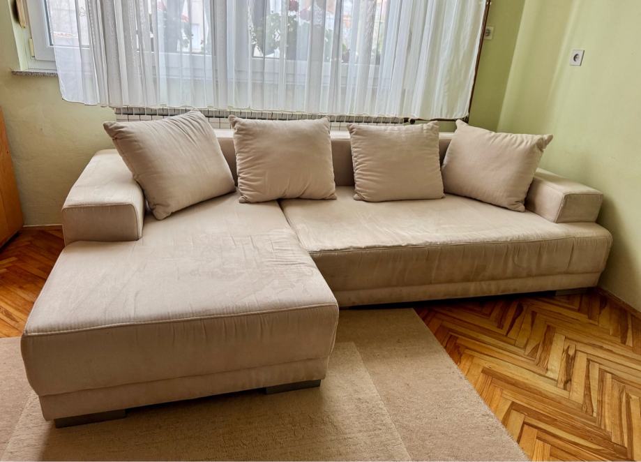 Kutna garnitura bež boje, širine 255 cm, dubine 105 cm / 150 cm. Vidljivi su tragovi korištenja (spužva sjedišta se stanjila) no još uvijek upotrebljiva.