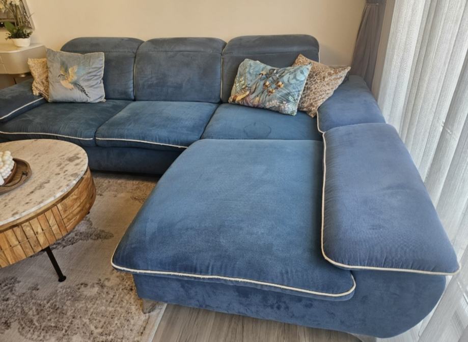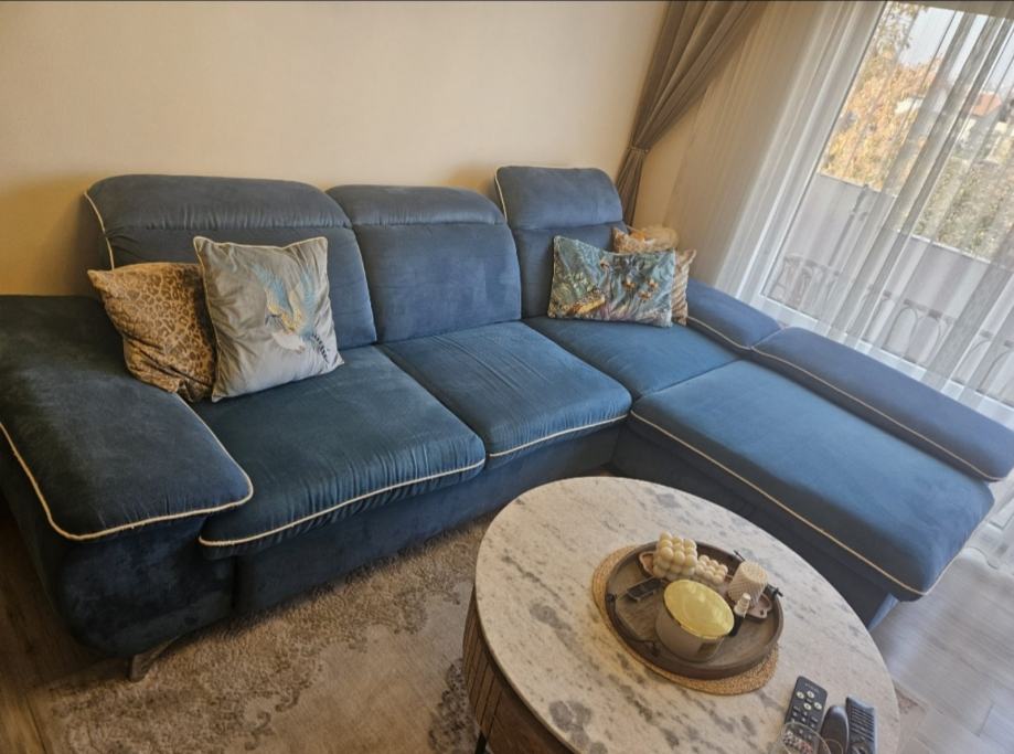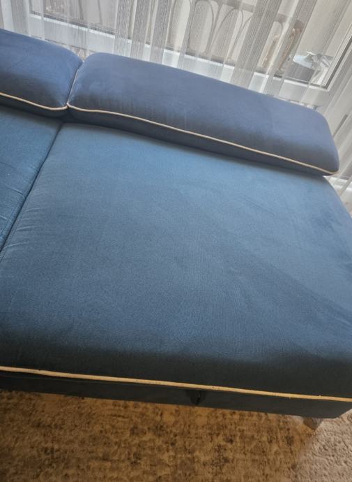 Rabljena, očuvana kutna garnitura na izvlačenje , dimenzije kao na slici. Na lijevom dijelu je dio na izvlačenje,a desni kut sadrži kutiju za odlaganje stvari.