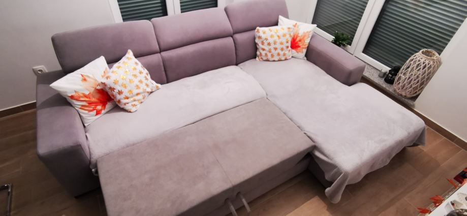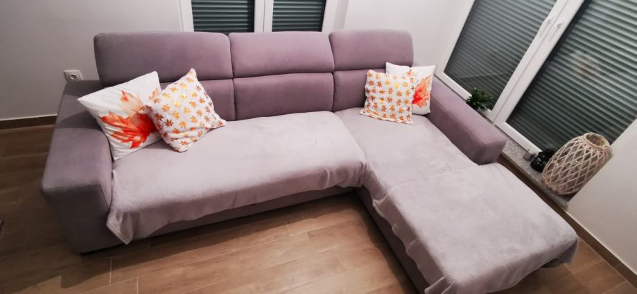 Kutna garnitura dužine 275cm, širine 95cm, u L dijelu 195cm.