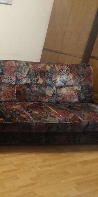 Kutna garnitura komplet trosjed, dvosjed, kut, tabure. U dobrom stanju, malo oštečena tkanina na trosjedu.