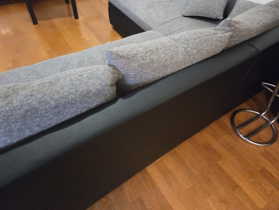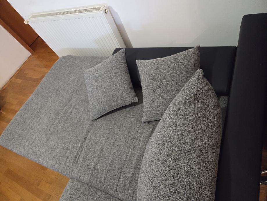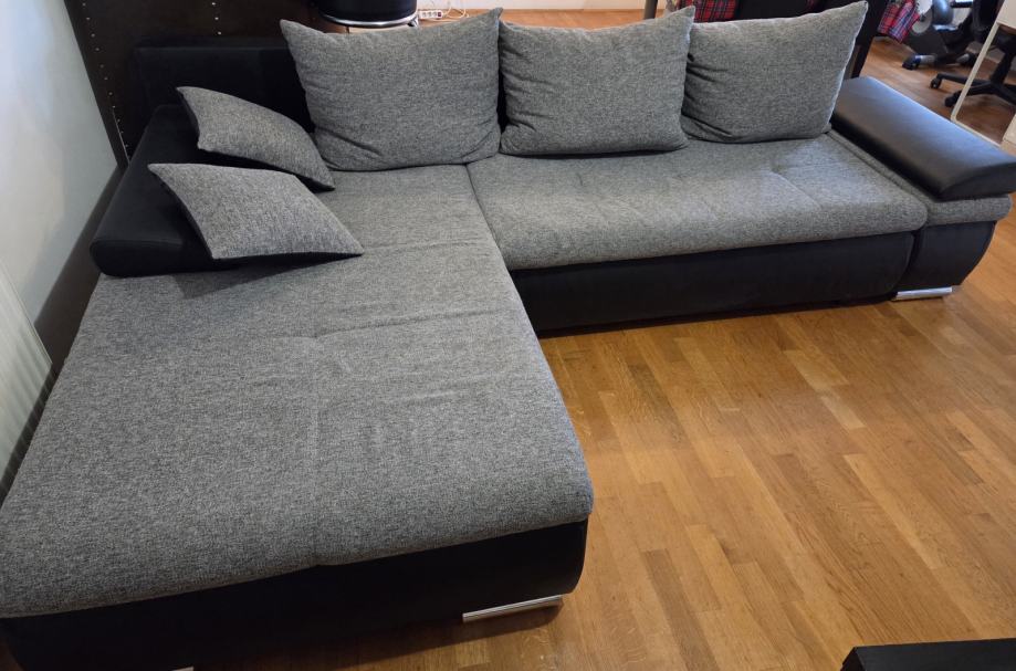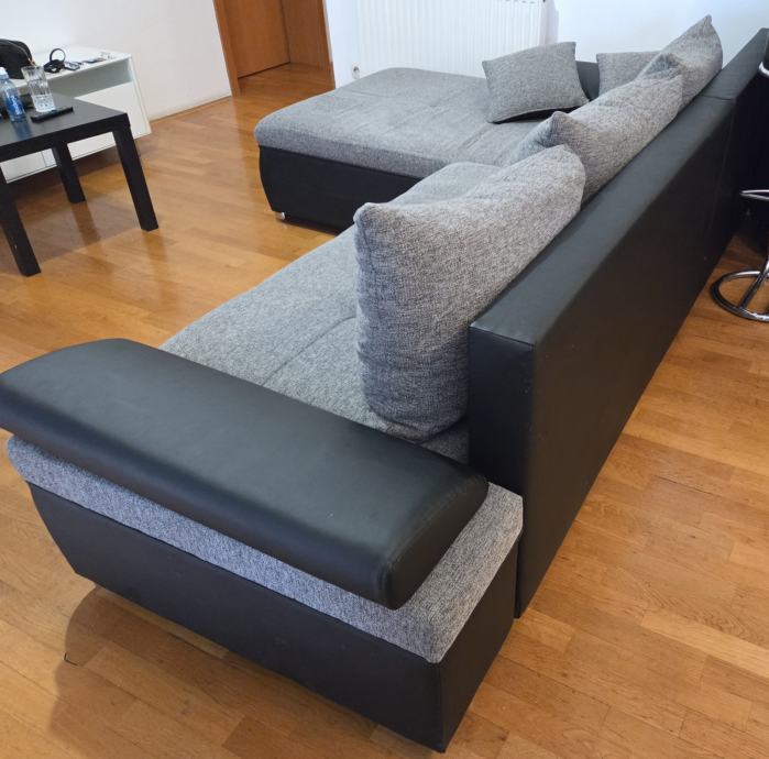 Prodajem kutnu garnituru skoro nova bez tragova koristena. Prodajem zbog preseljenja iz stana. Široka je 270 cm, visoka 75 cm, sjedeći prostor je dubok 90 cm, a ležaj je dubok 180 cm. Kut se moze mijenjati. Sjedeći dio se može i rastegnuti kako bi se dobio veći ležaj.Stan je 3kat bez lifta nije usko stubiste pa nije problem iznijeti ju. Kutnu mozete doci vidjeti da se uvjerite da je stvarno kao nova.Mozemo pomoc nositi, ali prijevoz nemamo.