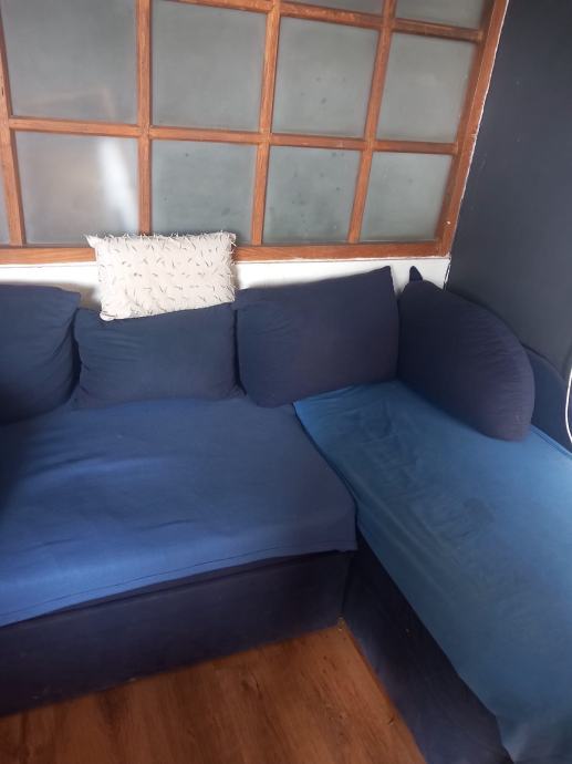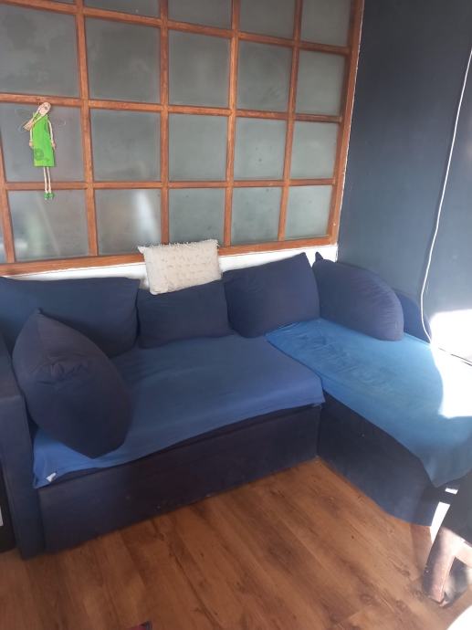 Kutna garnitura na izvlačenje sa spremištem, rabljena, ali potpuno ispravna. Dimenzija 210x 140x80. Može se izvući i proširiti u veći ležaj. U bočnom djelu koji se otvara prema gore nalazi se spremište.