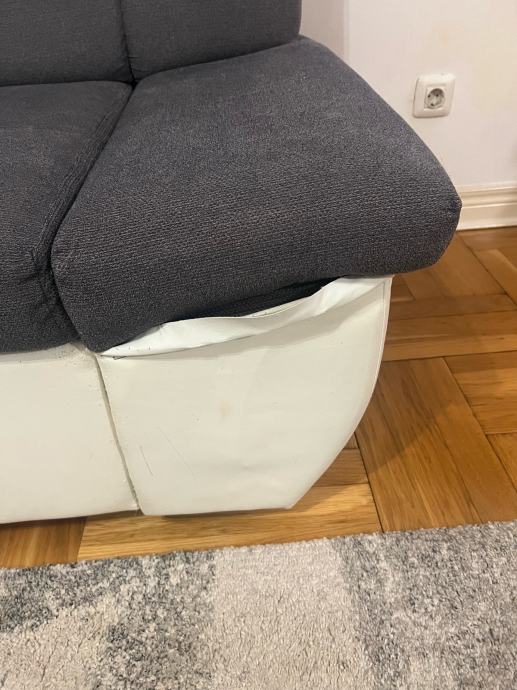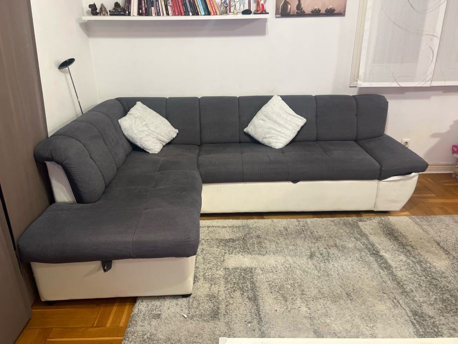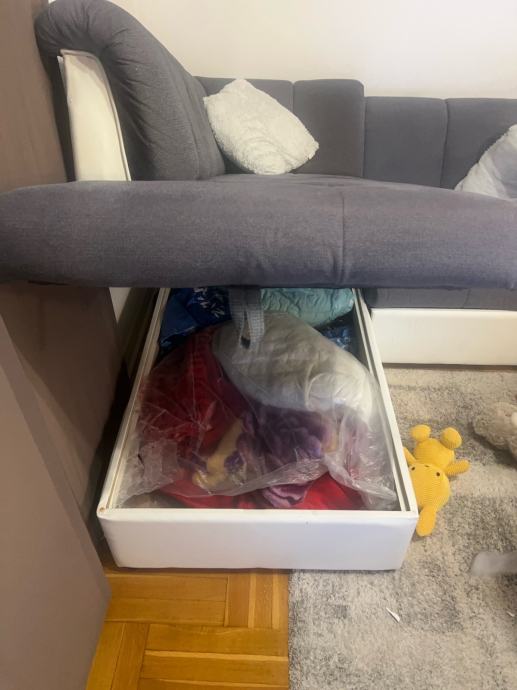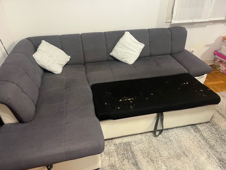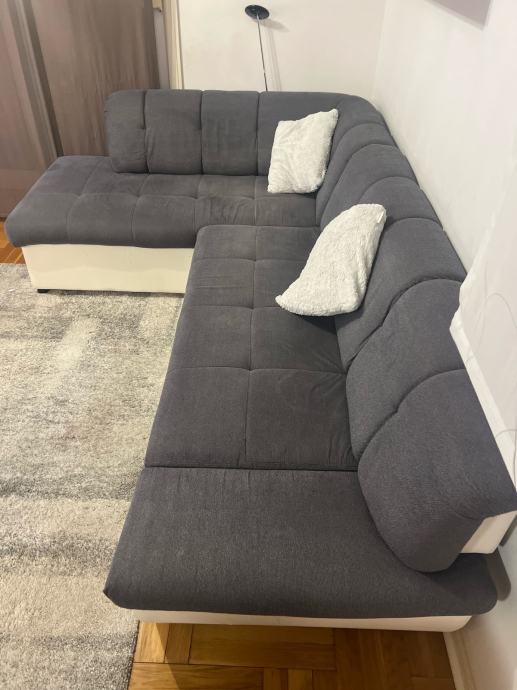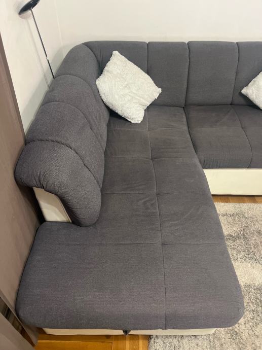 Prodajem rabljenu kutnu garnituru dimenzija: visina 85cm, dubina 183cm, širine 262 cm. Desni kut, sa spremnikom i ležajem za spavanje. Garnitura je stara 5 godina, još uvijek potpuno funkcionalna, no na slikama se vide oštećenja. Najbolje bi ju bilo presvući.