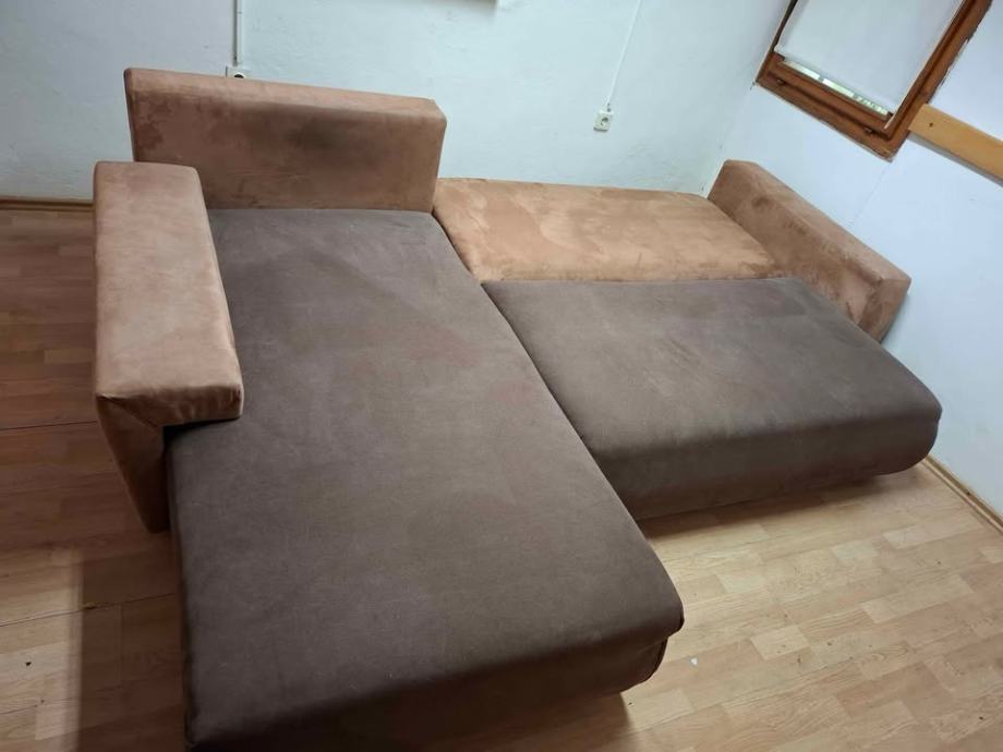 Prodajem kutnu garnituru. Kompletno je cijela novo presvučena. Potreno ju je očistiti jer se na njoj nakupilo prašine. Dimenzije 270x185 cm. Ležaj kada je razvučena 225x120 cm. Ima i kutiju za stavljanje posteljine i stvari.