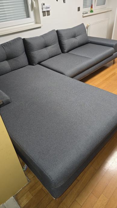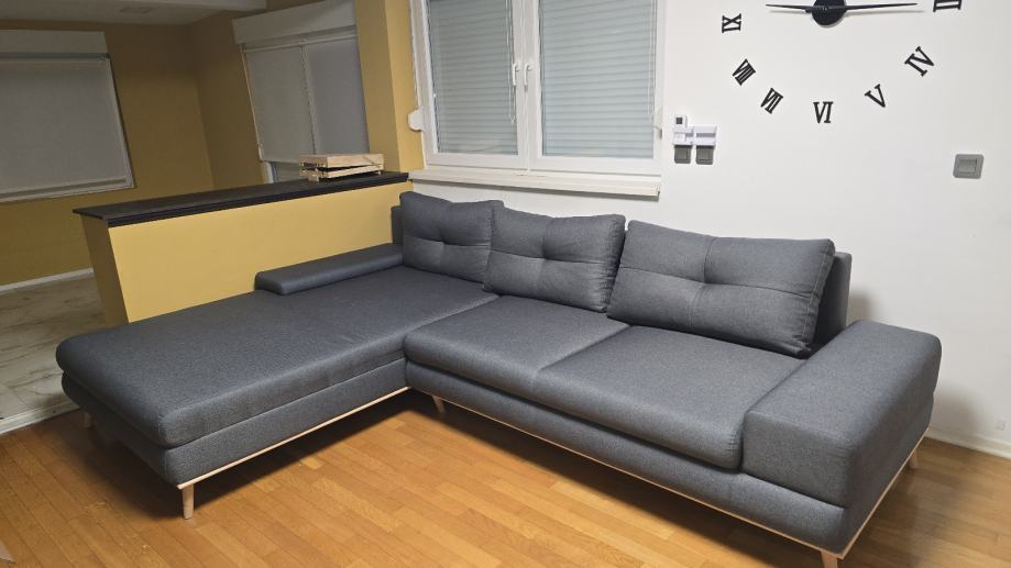Prodajemo kutnu garnituru sive boje dimenzija 310 cm (duljina uz zid) x 220 cm (duljina ležaja). Garnitura je u odličnom stanju, nigdje nije oštećena te se prodaje isključivo jer na ipak zauzima previše prostora.