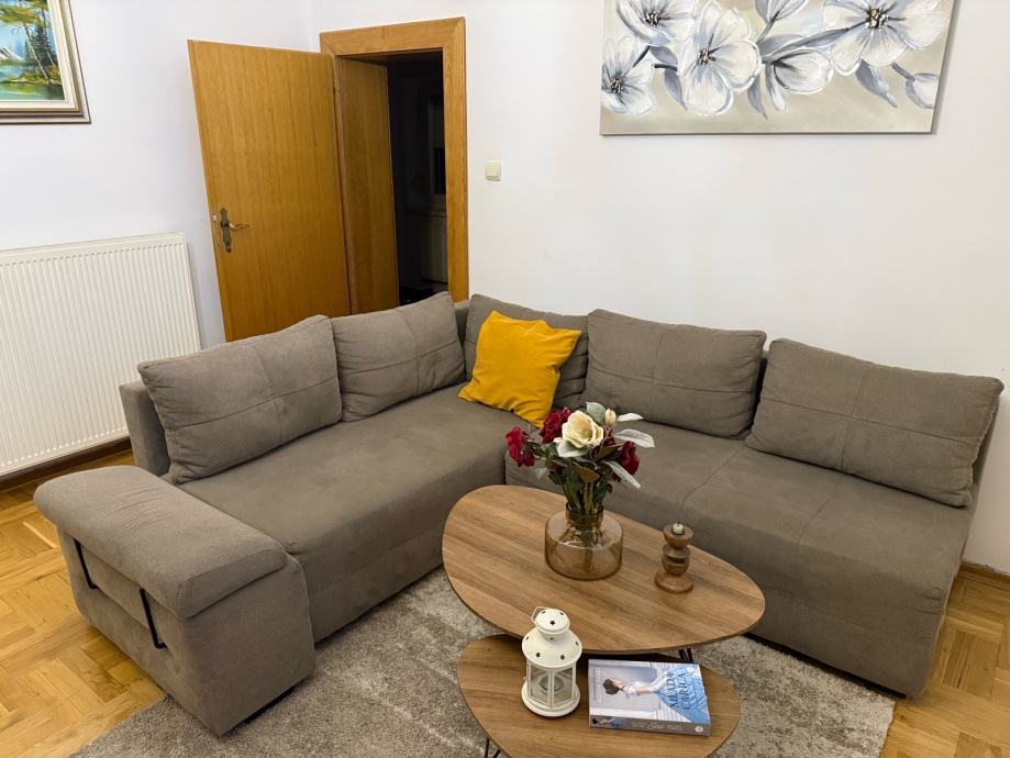 Modularna kutna garnitura koja može biti spojena ili odvojena. Očuvana.