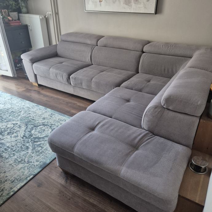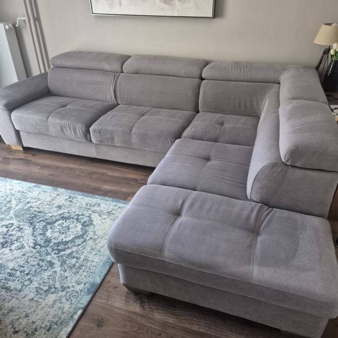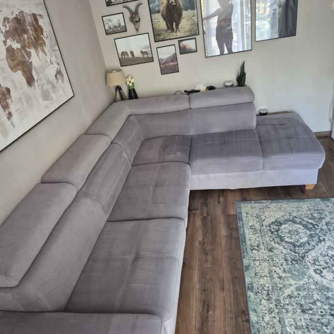 Prodajem kutnu garnituru BERTA s ležajem, spremnikom i podiznim naslonima za glavu 286x218x79 cm