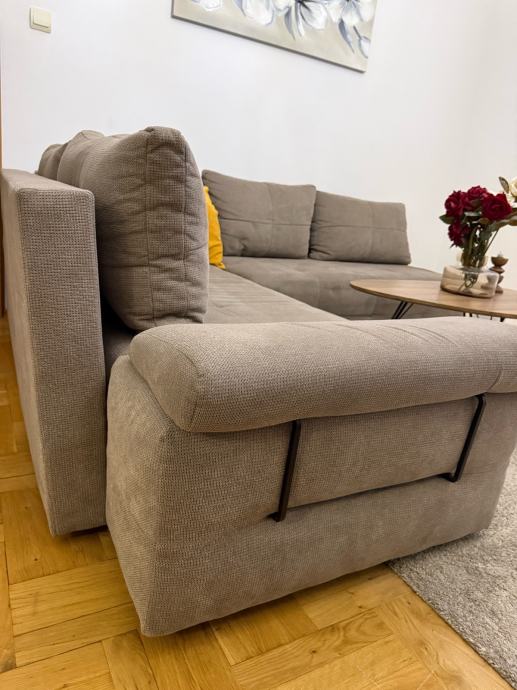 Prodajem kutnu garnituru u sivoj boji s funkcijom ležaja. Garnitura se sastoji od dva dijela koji čine udoban U oblik, što je praktično rješenje za dnevni boravak. Dio garniture ima mogućnost pretvaranja u ležaj, što pruža dodatni prostor za spavanje. Dolazi s nekoliko jastuka za sjedenje i dekorativnim jastucima. Također, ima dodatni prostor za pohranu ispod središnjeg dijela.