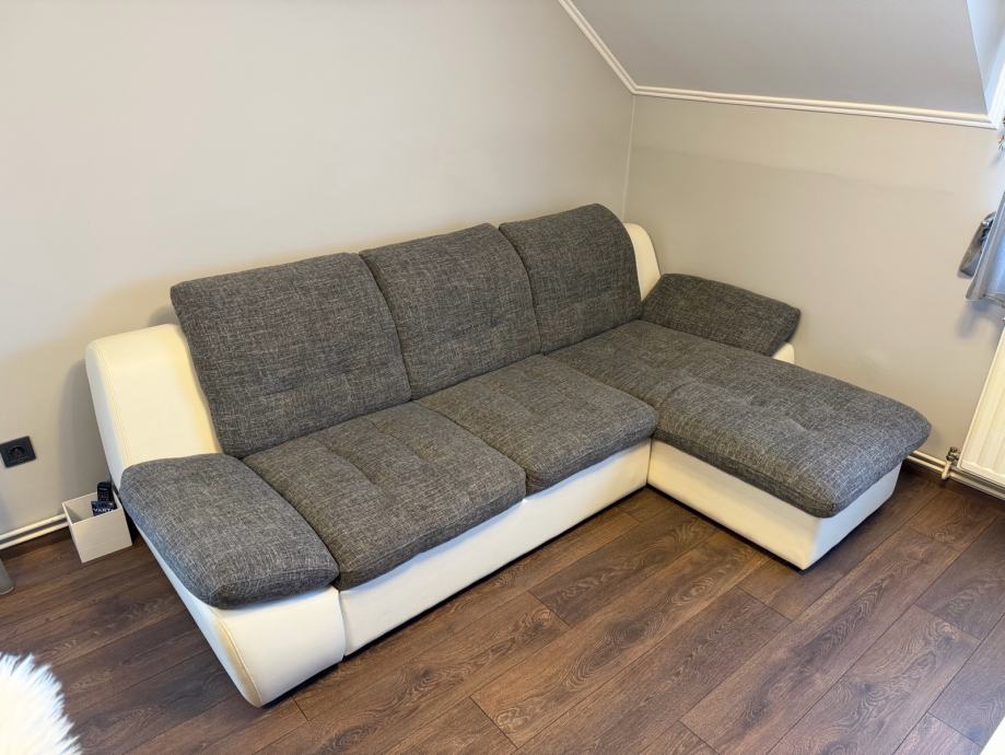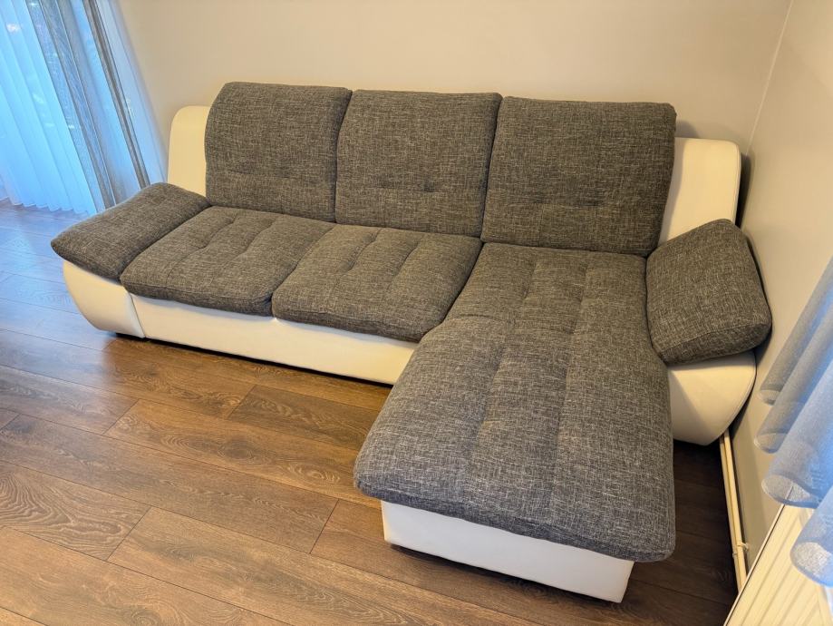 Prodajem kutnu garnituru u kombinaciji sive tkanine i bijele eko kože. Garnitura ima trosjed s kutnim dijelom (ležajem) s desne strane.