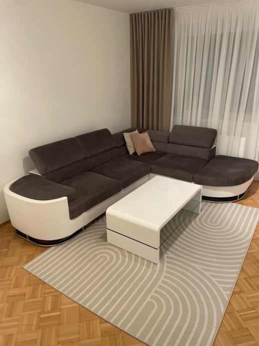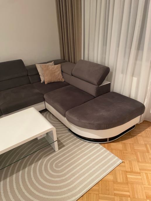 Prodajem kutnu garnituru u kombinaciji sive tkanine i bijele eko kože. Garnitura je modernog dizajna s karakterističnim zaobljenim naslonima za ruke i podesivim naslonom za glavu. Kutni dio završava prostranom ležaljkom, što pruža dodatan prostor za opuštanje. Dimenzijama dobro popunjava dnevni boravak i odgovara različitim prostornim rasporedom.