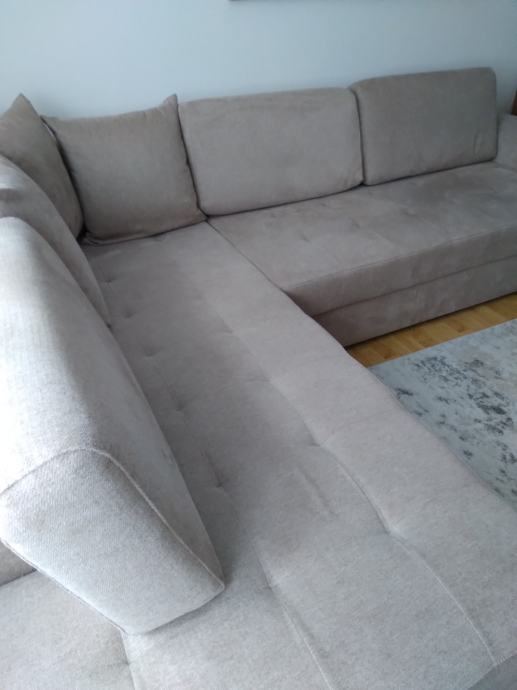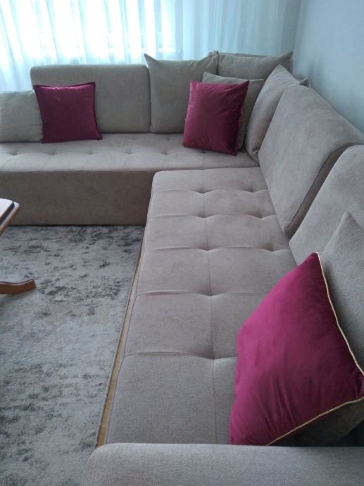 Prodaje se moderna i izuzetno udobna kutna garnitura dimenzija 282 x 215 cm, elegantne bež boje koja se lako uklapa u svaki interijer.