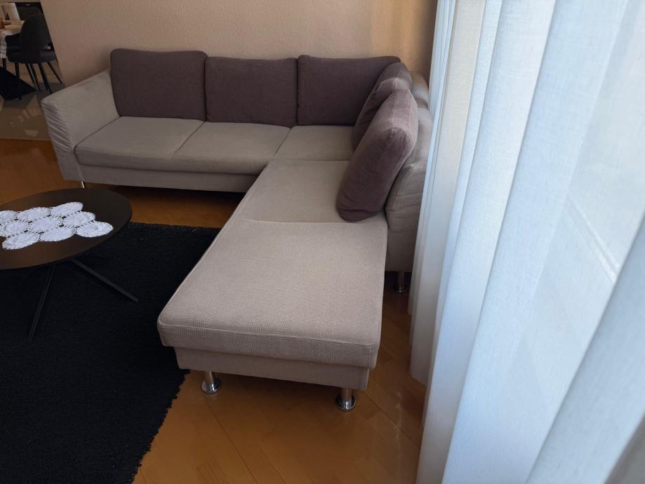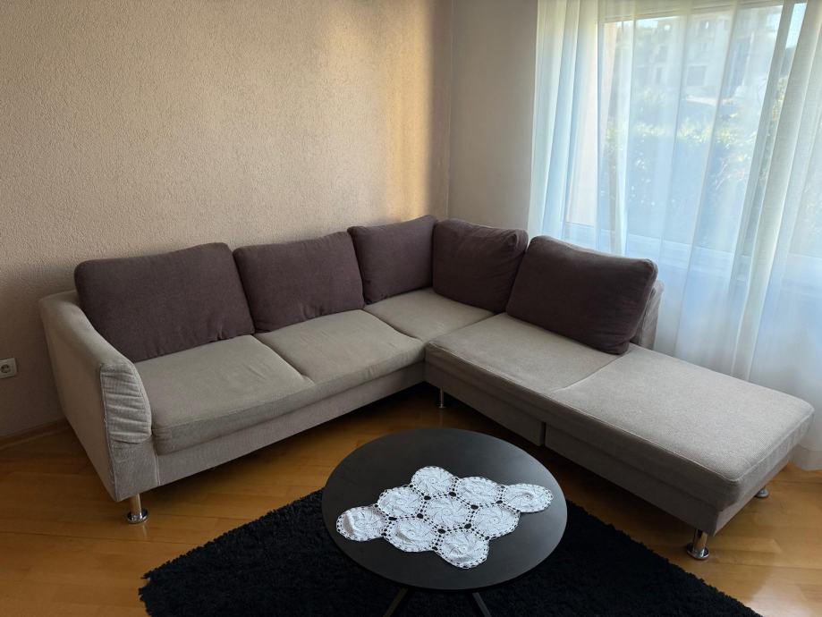 Kutna garnitura dimenzija 233 x 233 x90 cm. Zakretanjem jedne strane dobiva se ležaj za dvije osobe. Dostupno za preuzimanje krajem ožujka ili početkom travnja.